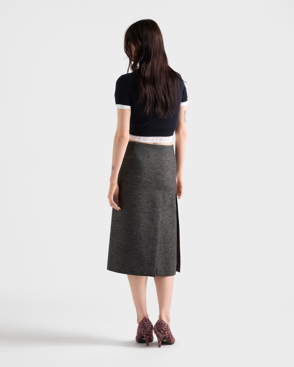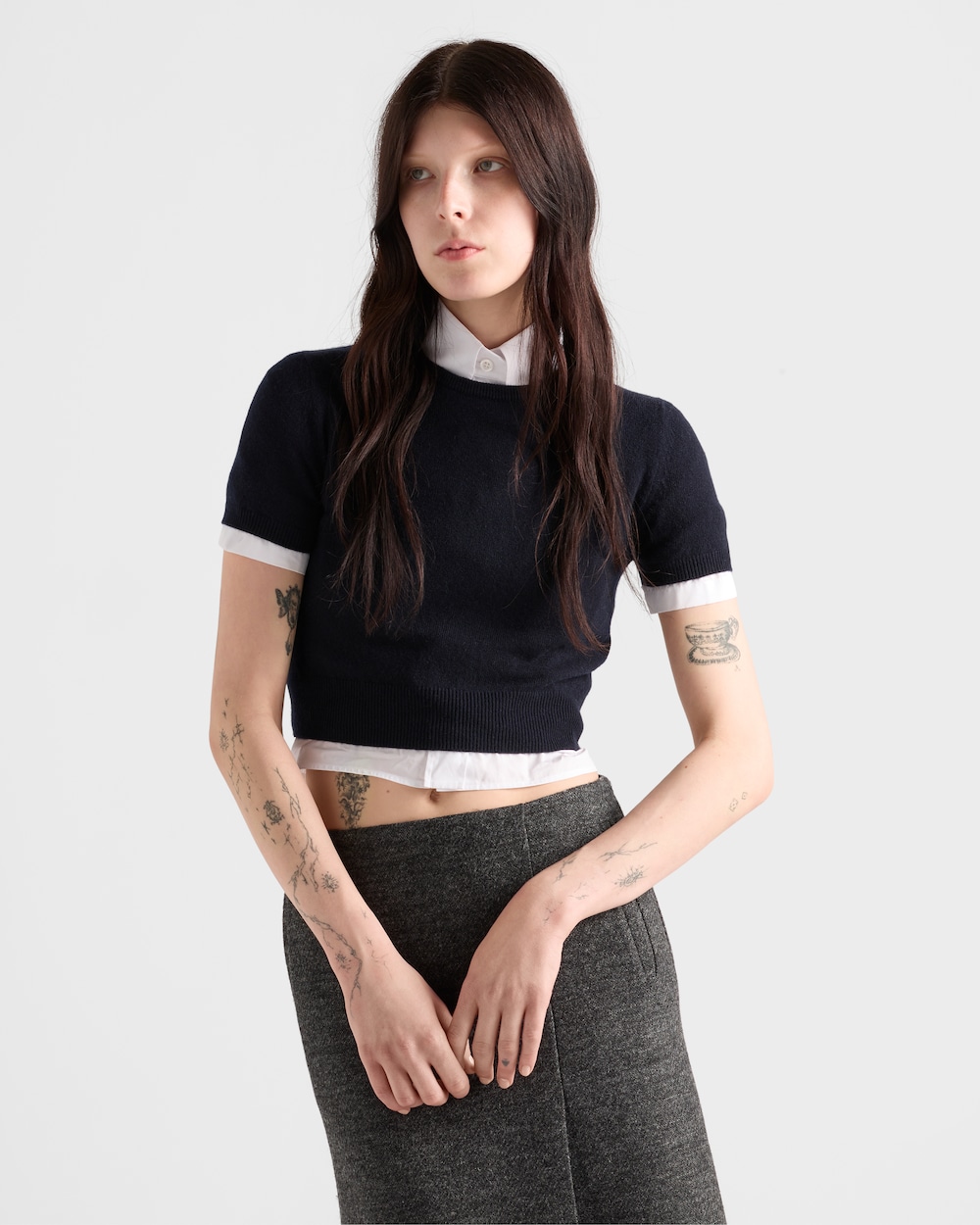 洗練されたラインとスリムなプロポーション。このスリムフィットのセーターは、プレーンニットのカシミヤ素材で仕立てられており、セミラグランショルダーと半袖のディテールが特徴です。シンプルでありながら緻密に設計された、アイコニックかつ汎用性の高い一着です。
