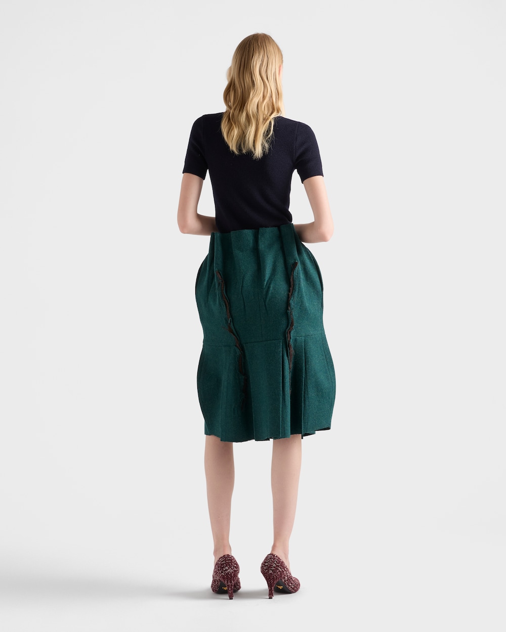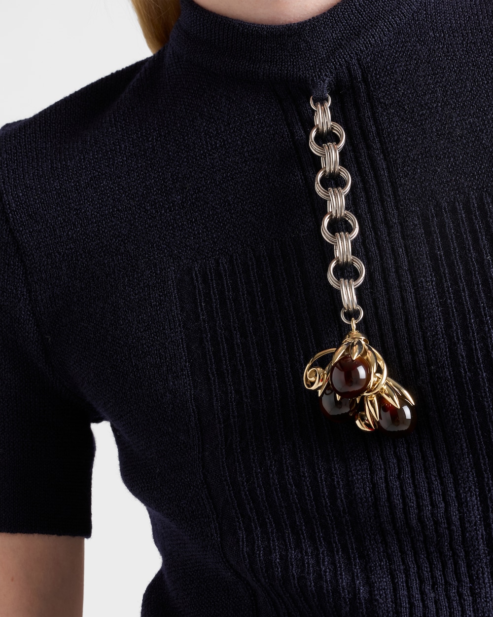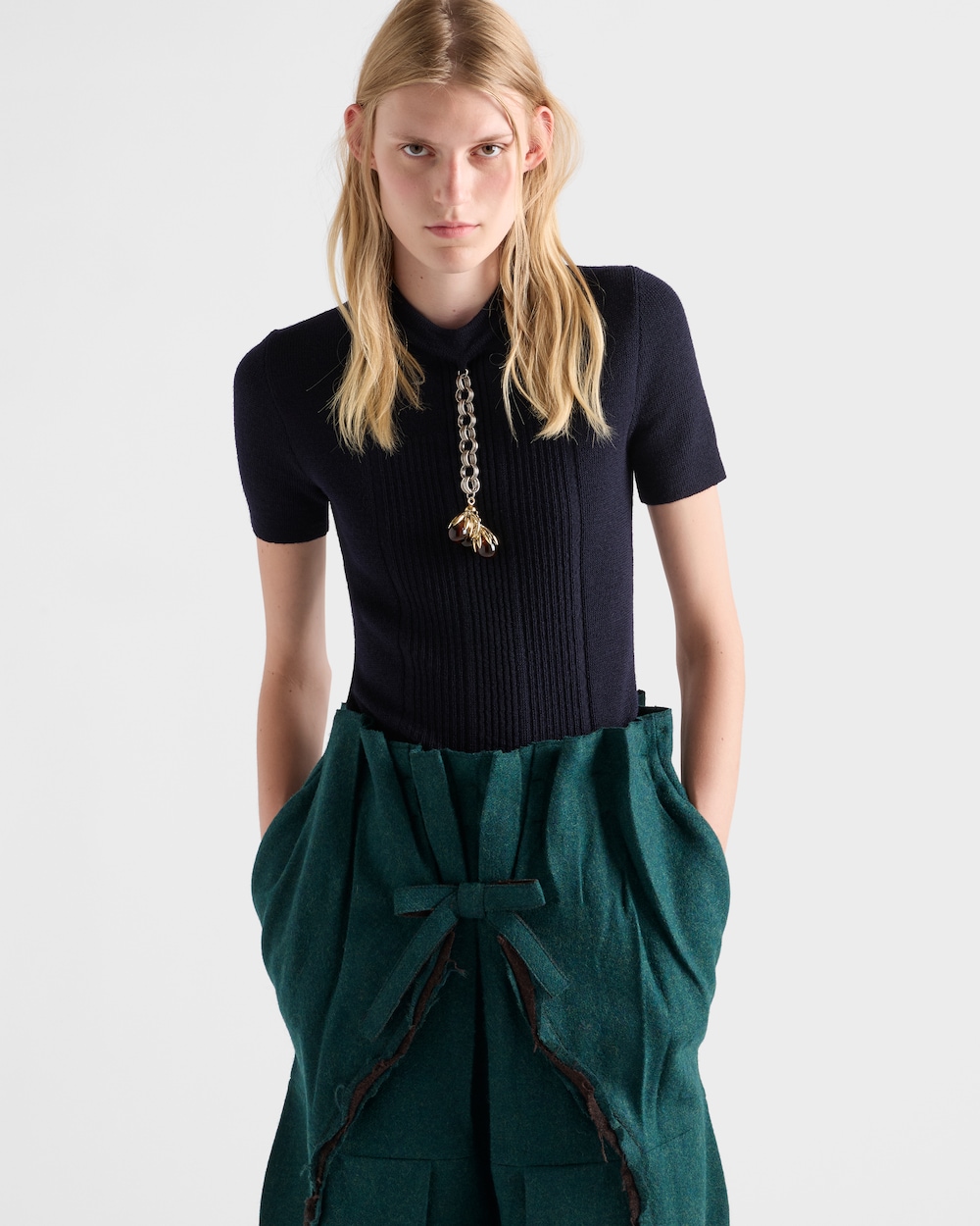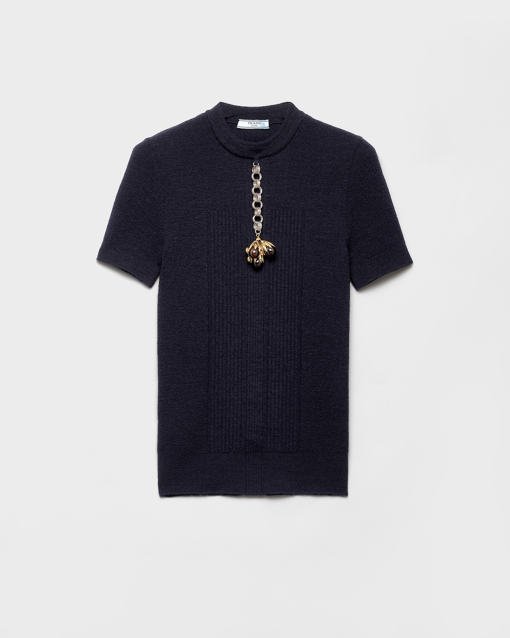 2025年秋冬コレクションでは、ニットウェアがジュエルディテールで飾られ、シンプルさと装飾が織りなす新たな対話が生まれています。この半袖ウールセーターは、柔らかくスリムなシルエットに仕立てられ、洗練されたメタルとマザーオブパールのペンダントで美しく飾られています。