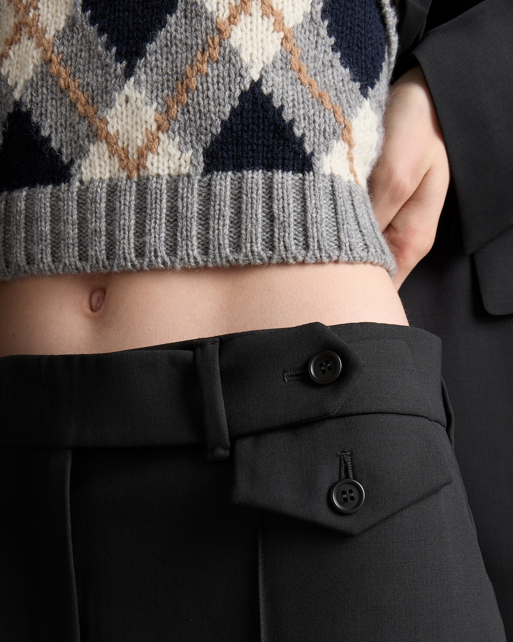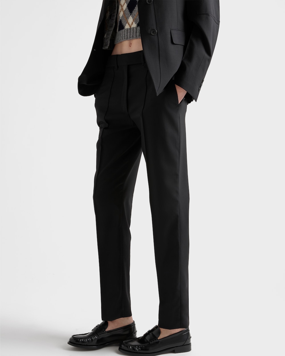 テーパードカットと仕立ての美しさが際立つディテールが特徴の、メンズウェアスタイルのパンツ。軽量ウールを使用し、同色のファブリック製トライアングルロゴで仕上げられています。