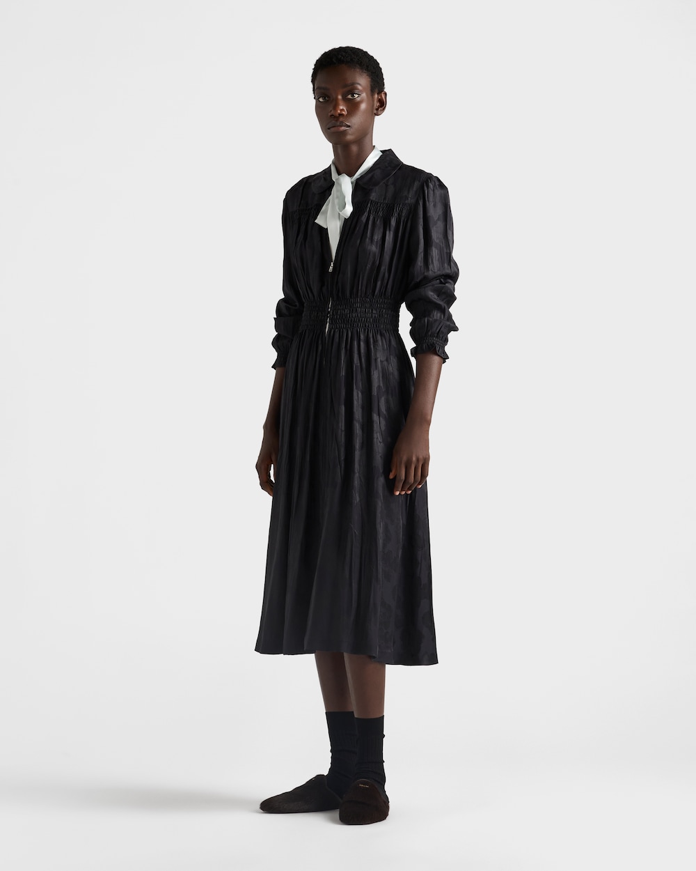 ロマンティックなディテールとスポーティーなアクセントがこのドレスに意外性のあるコントラストをもたらします。女性らしさを新たな視点で再解釈し、ジャカード編みのフローラルパターンがシルエットに豊かな表情を添えます。ヴィンテージ風の魅力が、ハイブリッドなデザインに奥行きを加えています。