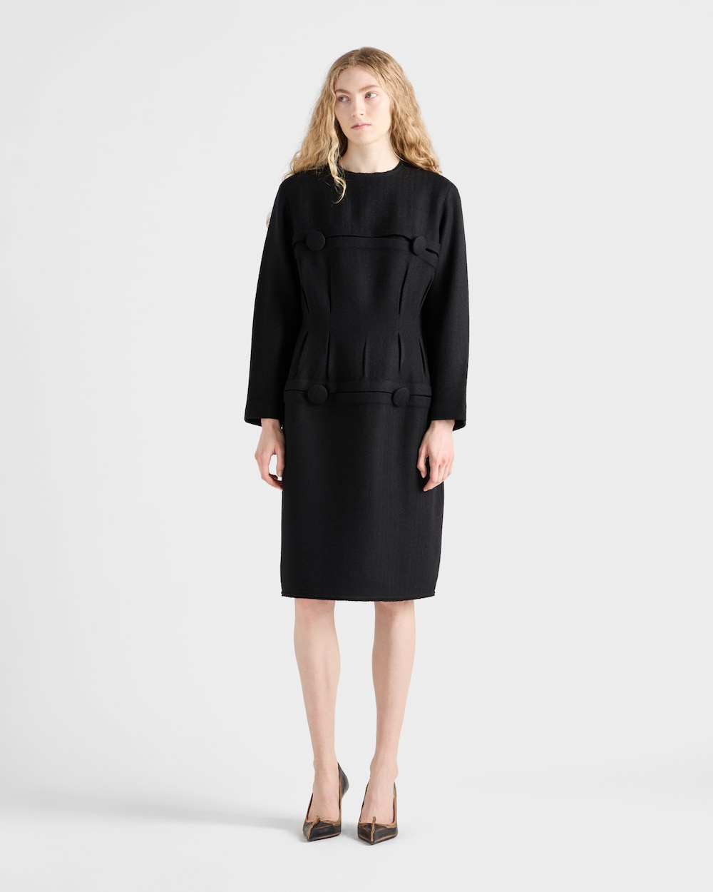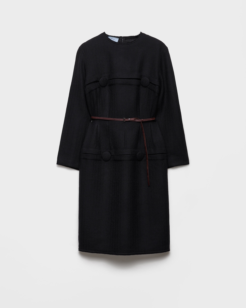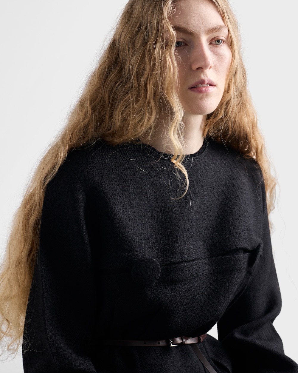 2025年秋冬コレクションは、フェミニニティの概念を探求し、その象徴を再定義します。その出発点はブラックドレス。シルエットは、新たなプロポーション、広がりのあるライン、そしてユニークなディテールによって再構築されています。シェブロンウールを使用したこの長袖スタイルは、同系色のオーバーサイズボタンとコントラストの効いたレザーベルトが特徴で、切りっぱなしの裾が本能的で型破りなエレガンスを際立たせます。