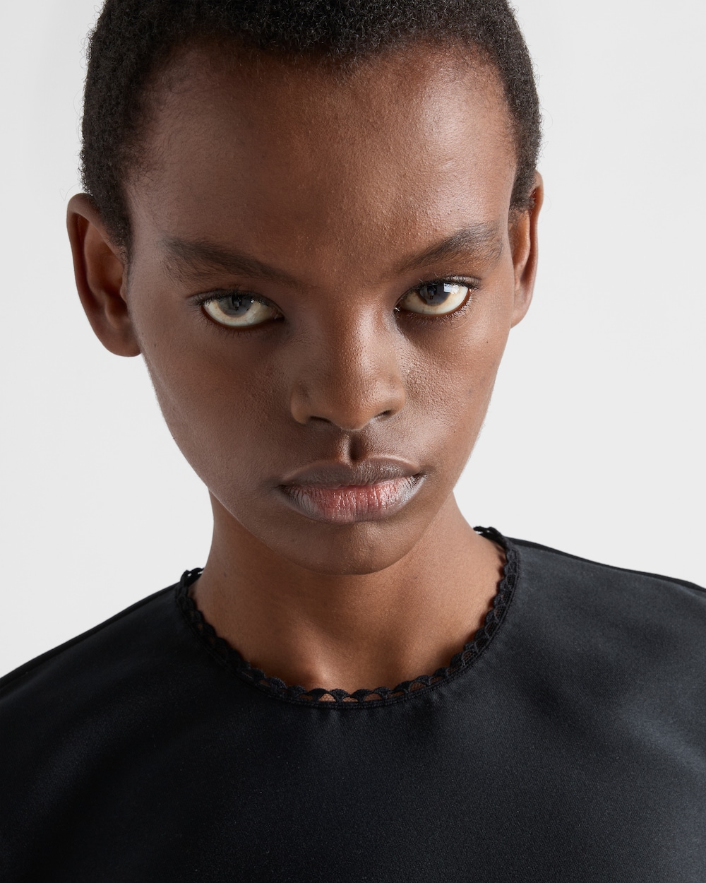 ラインと素材の独自の融合が洗練されたシルエットを描き出すスキューバ・ミニドレス。レーストリムがコンテンポラリーなハイブリッドウェアにロマンティックなニュアンスを添えます。