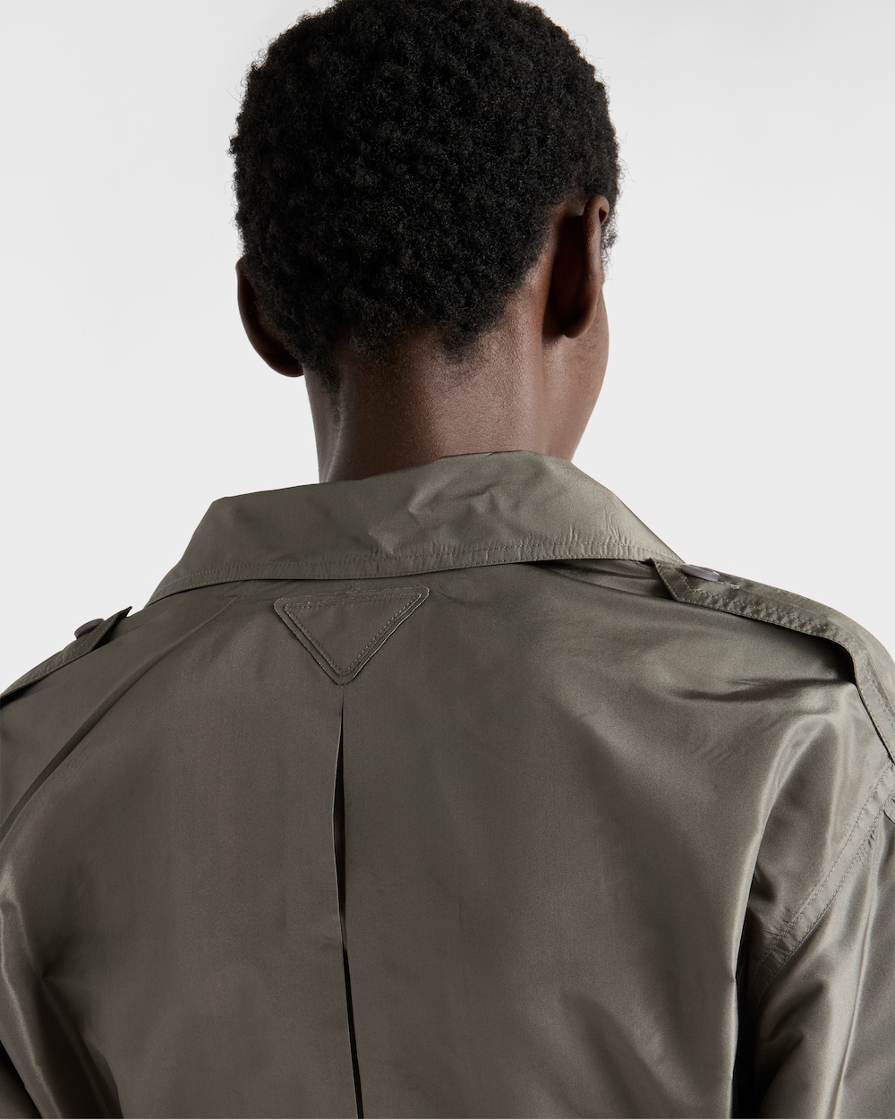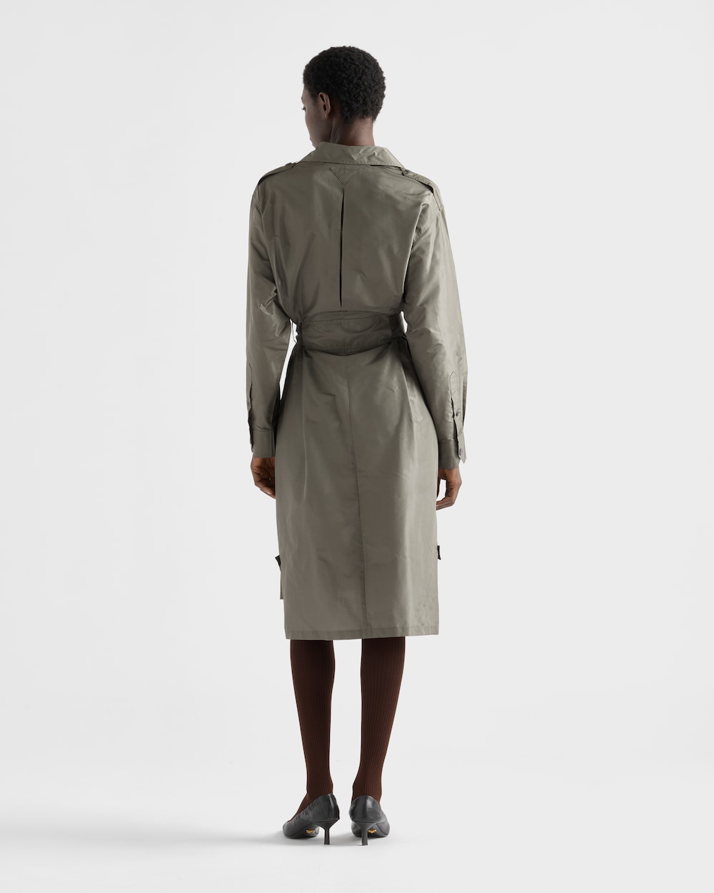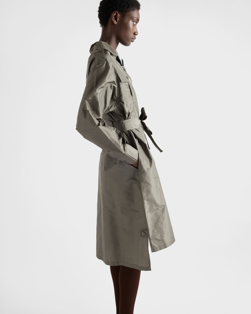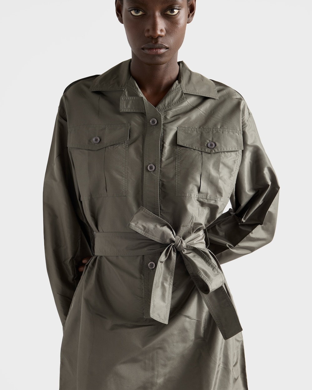 サルトリアルな厳格さと軽やかなラインが融合したシャツドレス。詩的でカジュアルなエレガンスを表現しています。タフタドレスは、柔らかさと構築的なフォルムが融合し、プラダワードローブの定番を再定義するシルエットが特徴です。
