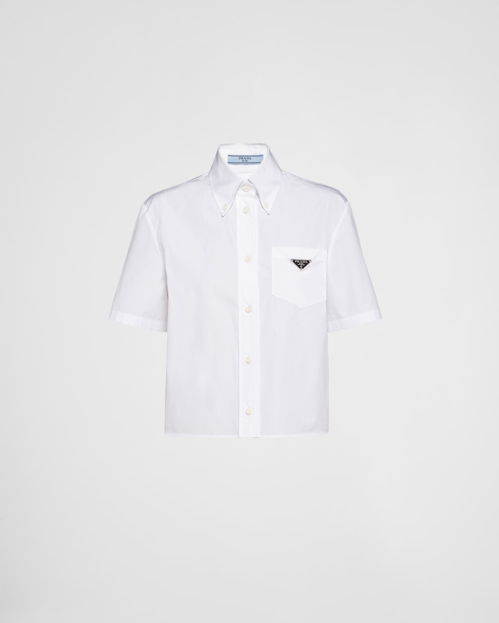 ややクロップド丈のポプリン シャツ。モダンな魅力のミニマリストなデザインが特徴。ボタンダウンカラーと半袖の洗練されたスタイルにエナメルメタルのトライアングルロゴがあしらわれています。