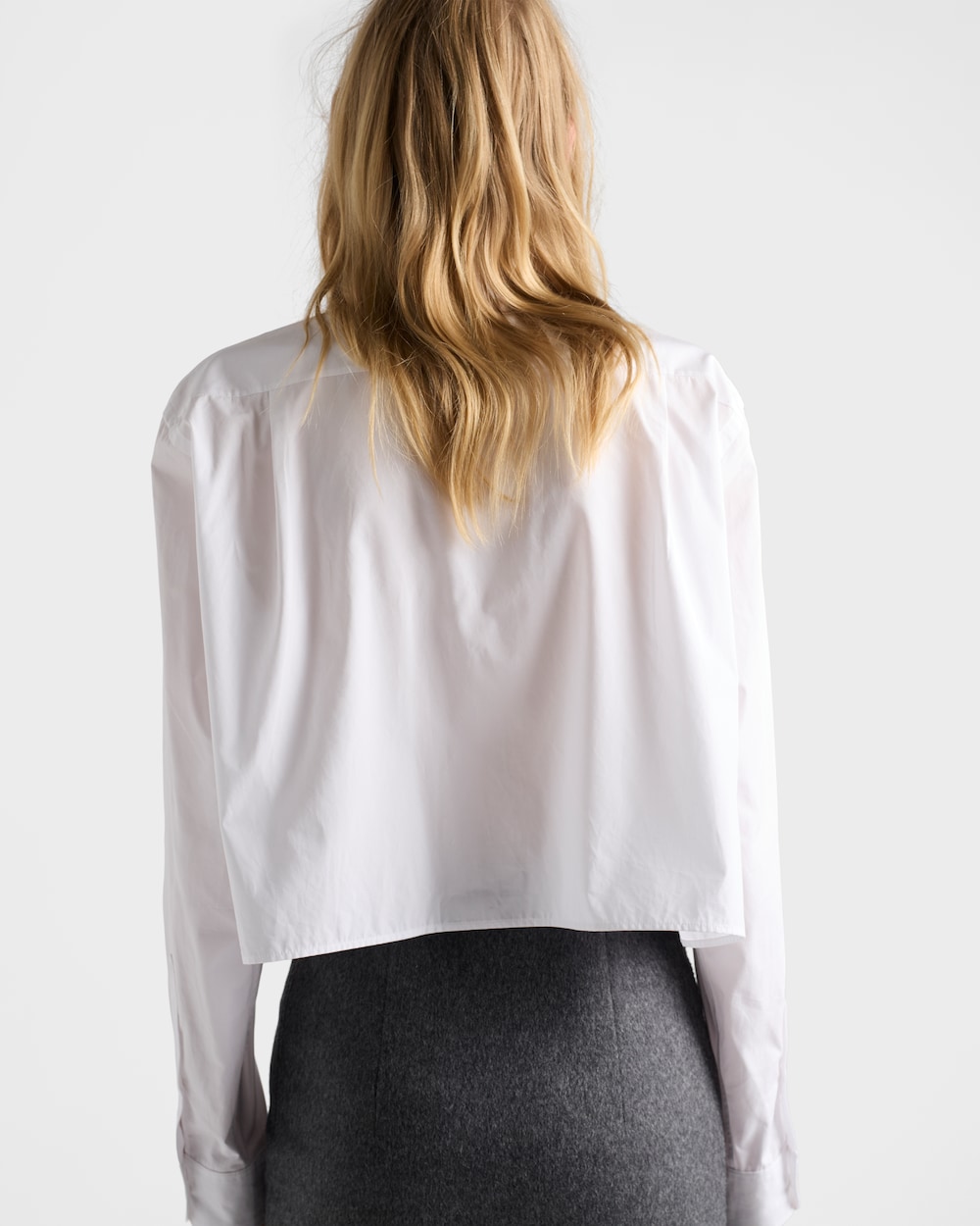 このシャツはコットンポプリン素材を使用し、クラシックなディテールに女性らしいアクセントを加えたデザインです。クロップドシルエットに、小さなパッチポケットとボウタイ付きの襟があしらわれたデザインが特徴です。