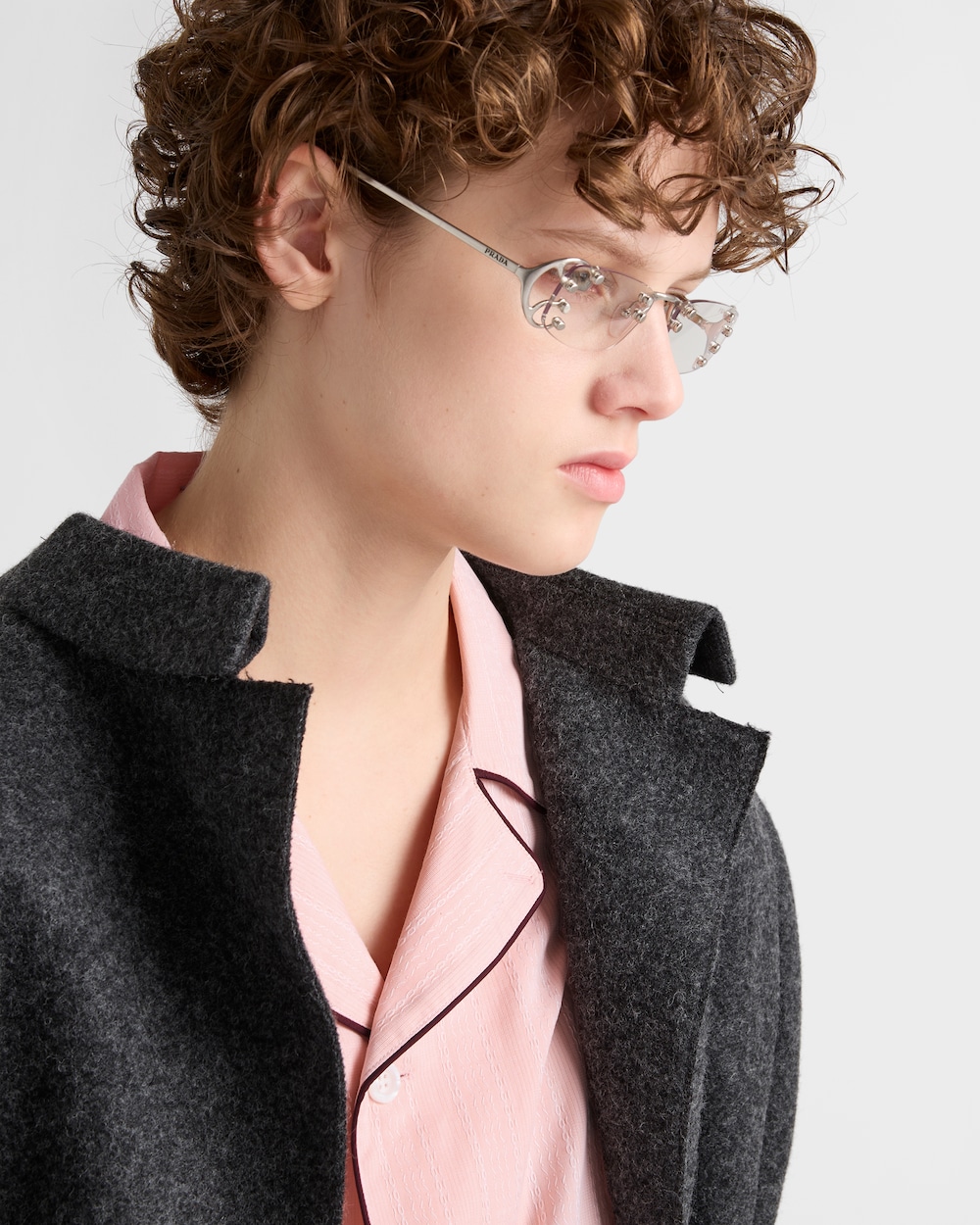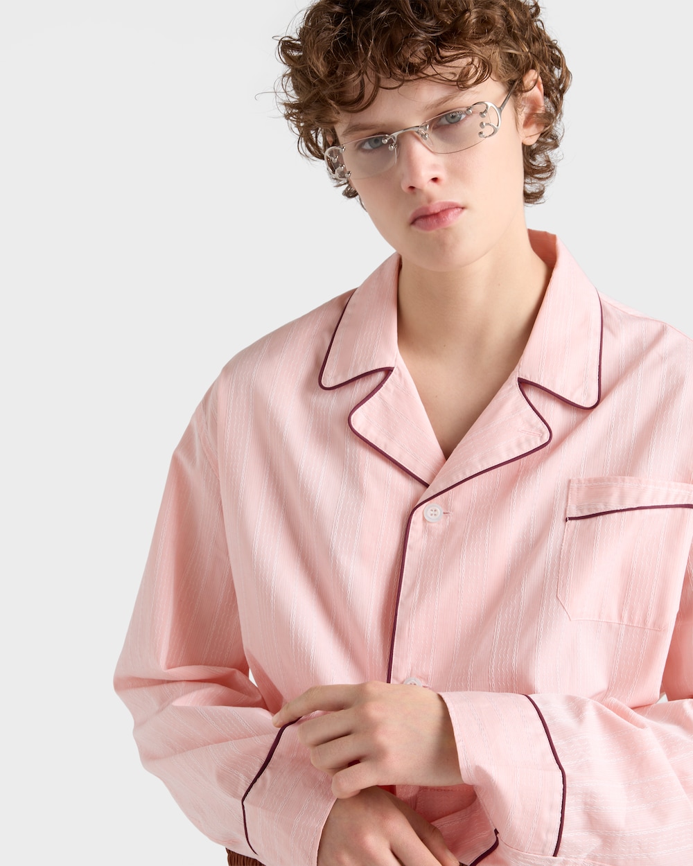 このシャツは、パジャマを日常着として再解釈したデザインです。ボウリングカラーを特徴とし、コットン素材にコントラストの効いたパイピングをあしらった、オーバーサイズのミニマルなシルエットが魅力です。