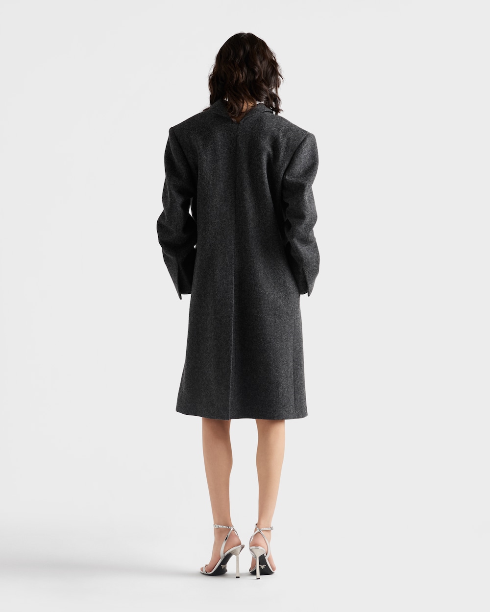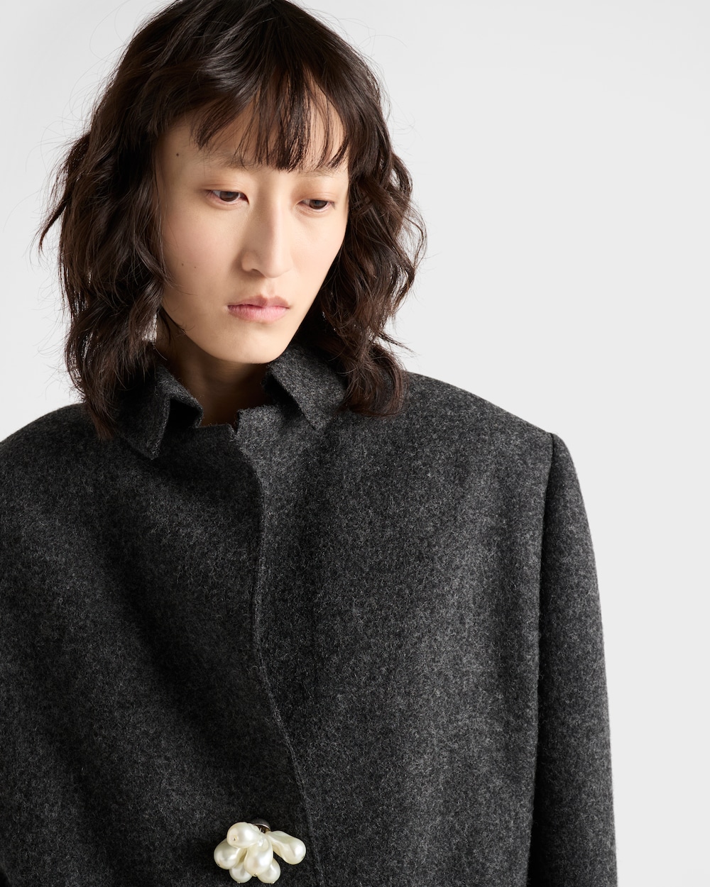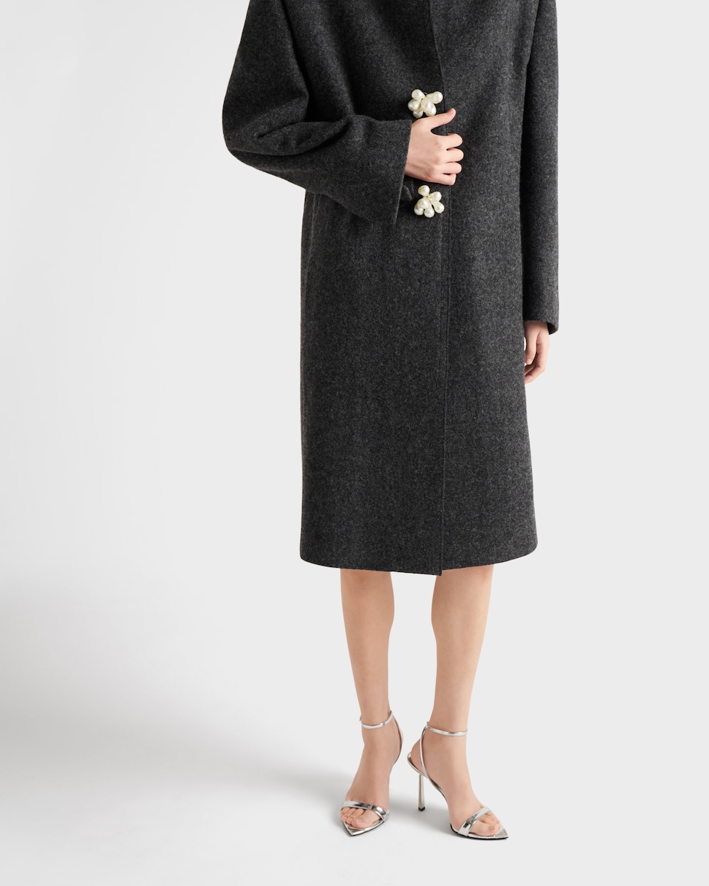 サルトリアルな精密さと、予期せぬ不完全さの美が融合したシェットランドウールのコート。ジュエルボタンがアクセントとなり、洗練された構造に、逆さの襟という意外性のあるディテールが加わることで、モダニストらしい魅力を引き立てています。