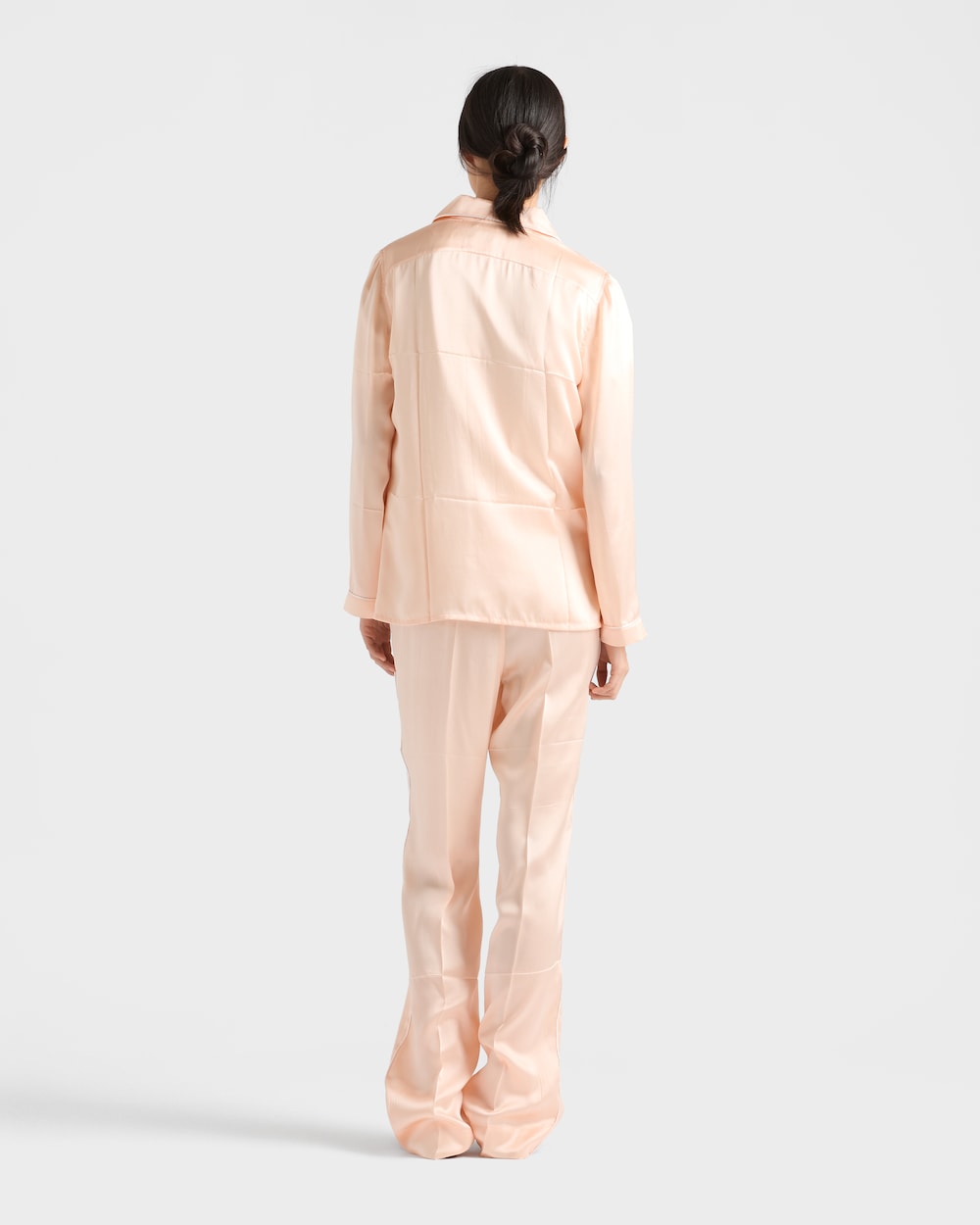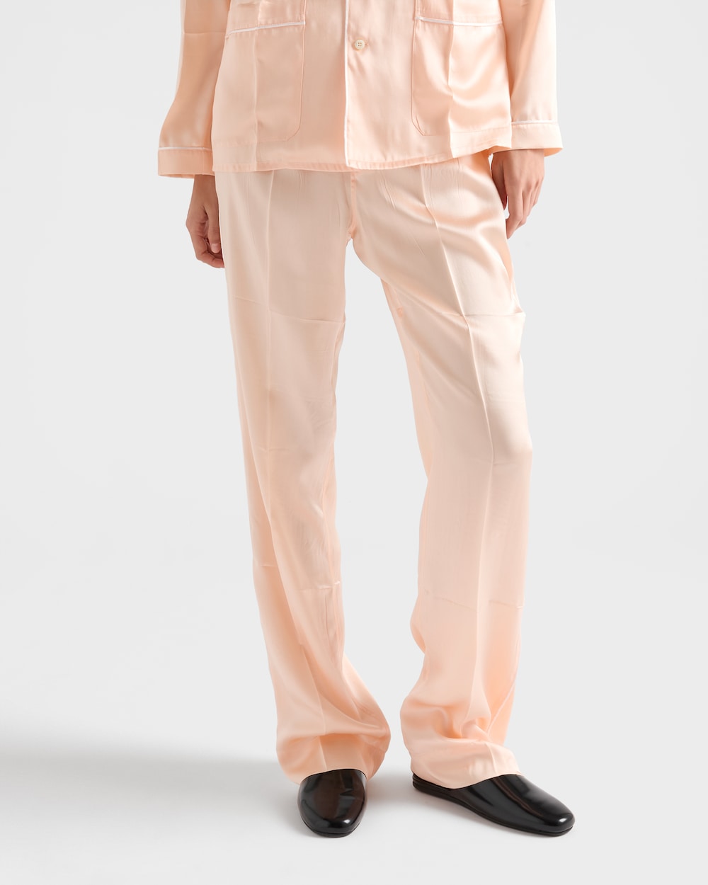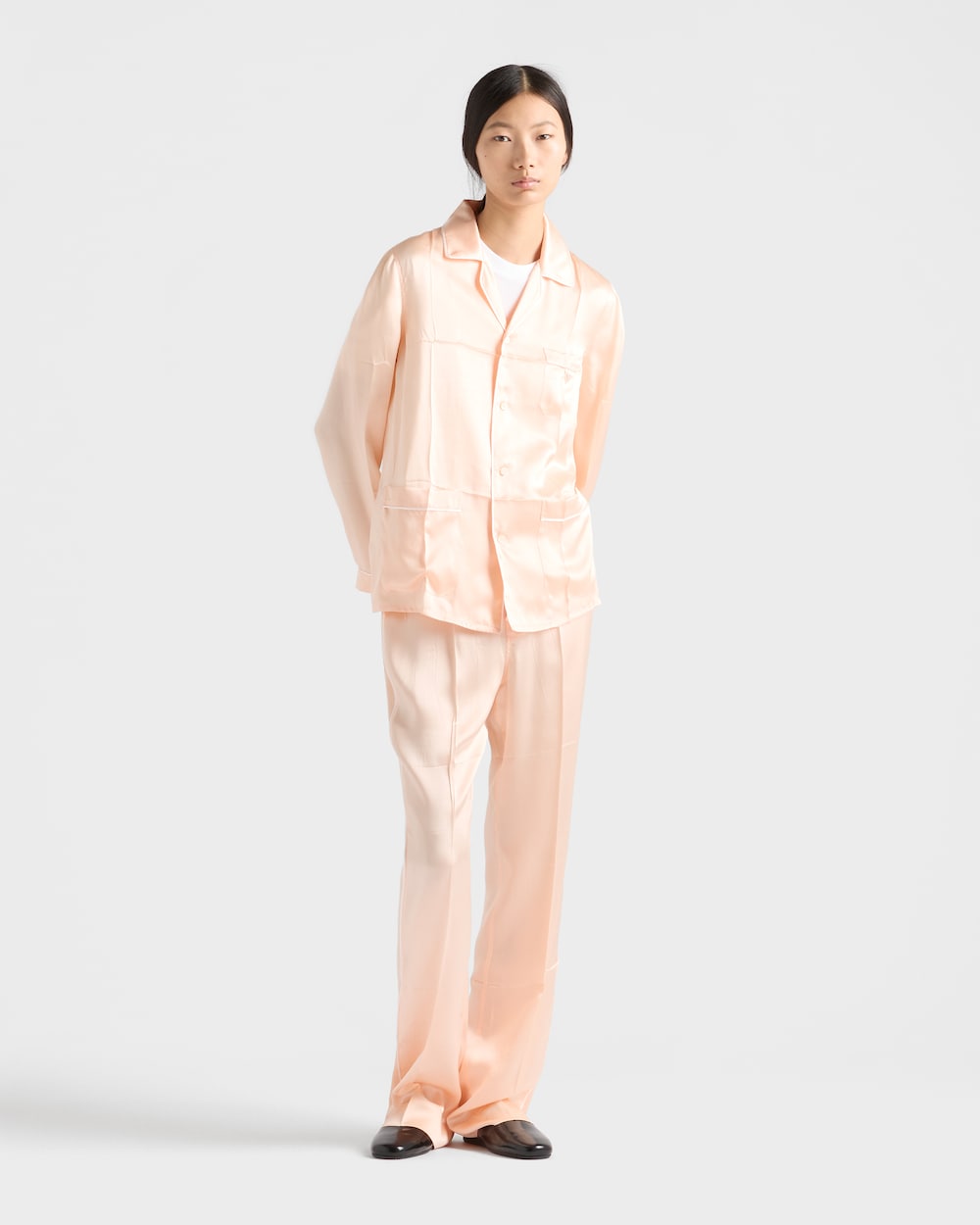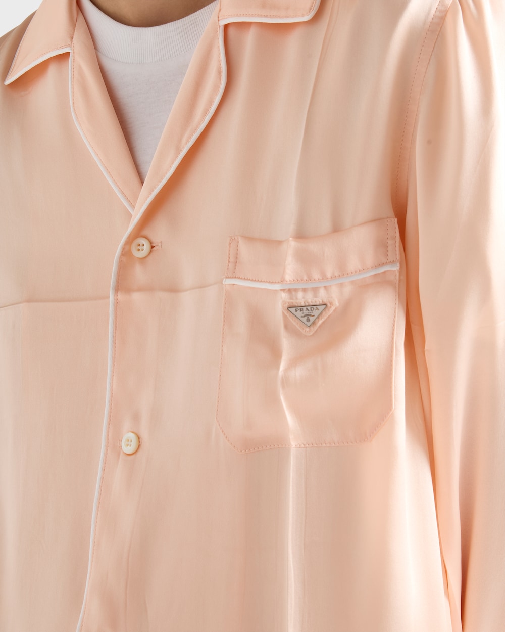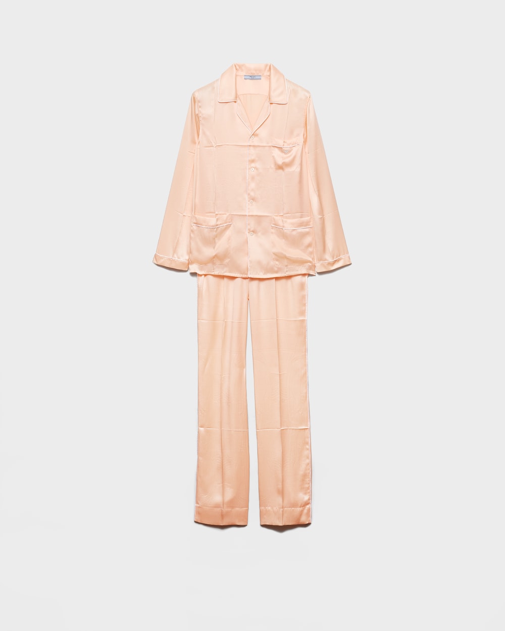 ヴィンテージ仕上げのサテン素材を使用したこのパジャマは、コントラストの効いたパイピングがアクセントとなり、エレガンスと快適さを兼ね備えたデザインに仕上がっています。洗練された魅力を放つこの装いは、上質なマザーオブパールボタンによってさらに豊かな表情を添えています。