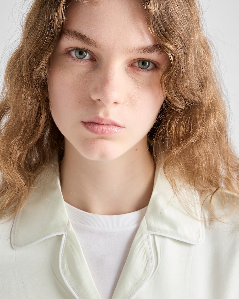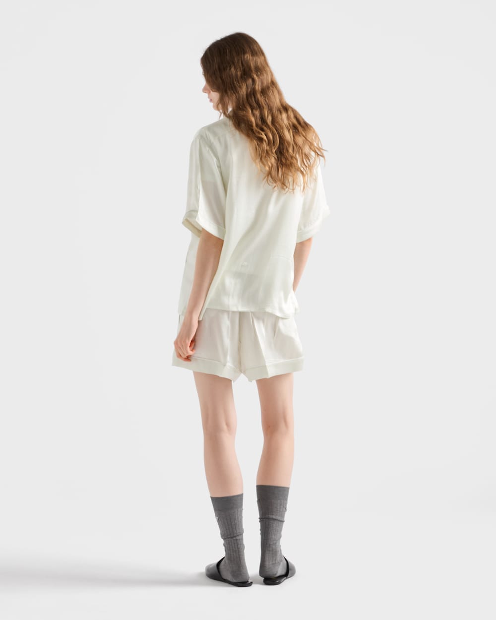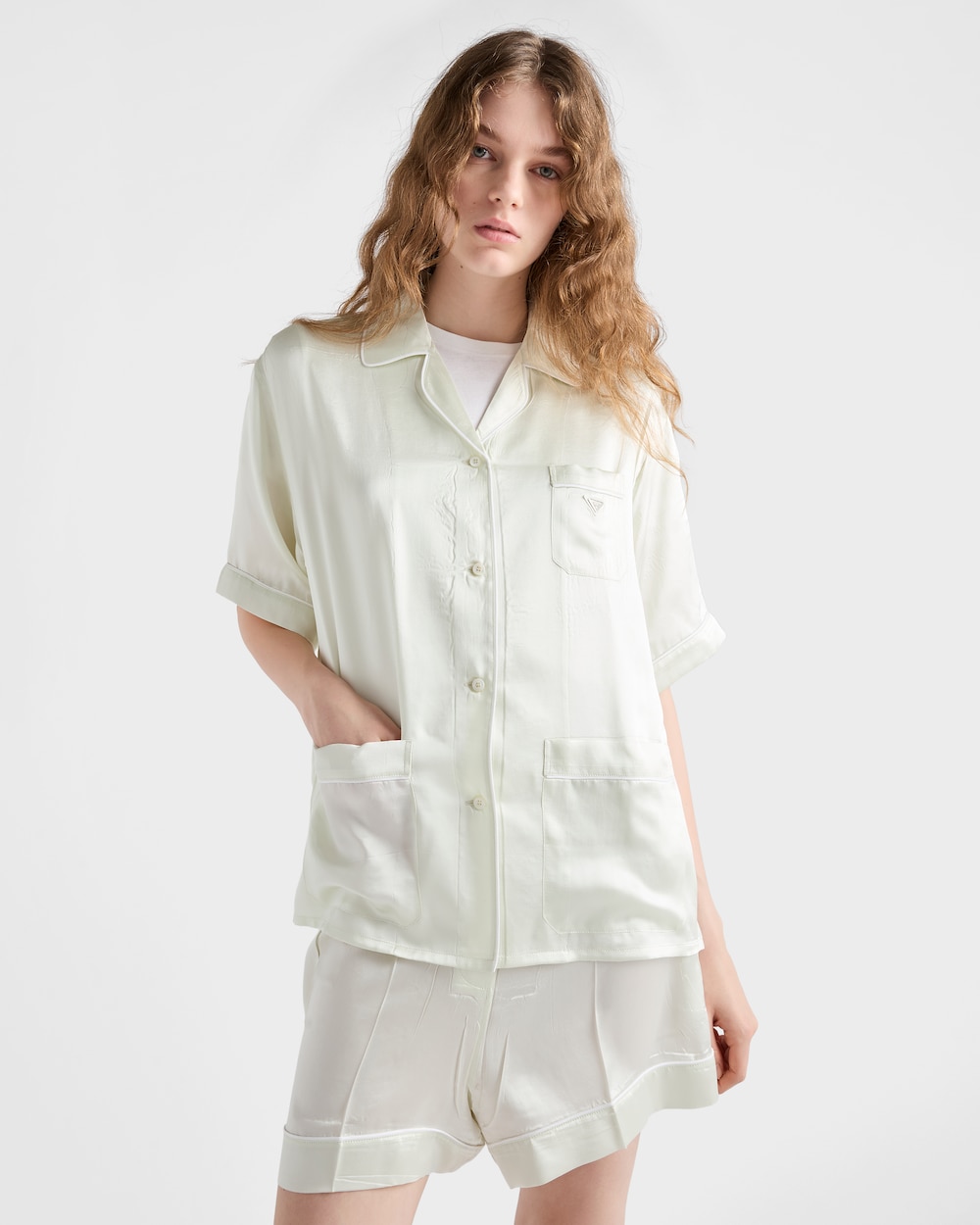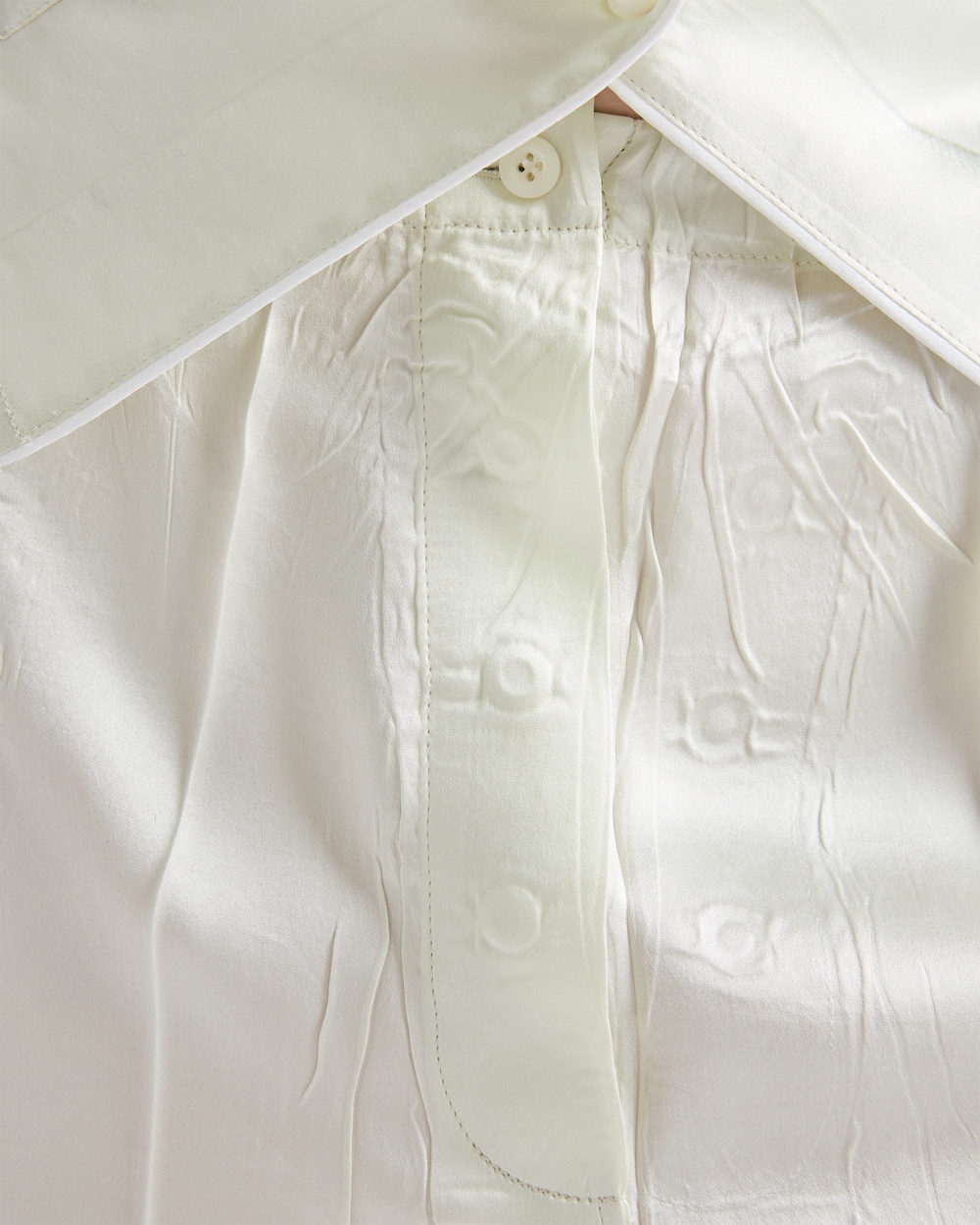ヴィンテージ仕上げのサテン素材を使用したこのパジャマは、コントラストの効いたパイピングがアクセントとなり、エレガンスと快適さを兼ね備えたデザインに仕上がっています。半袖のセットアップとショートパンツは、洗練されたマザーオブパールボタンで彩られています。