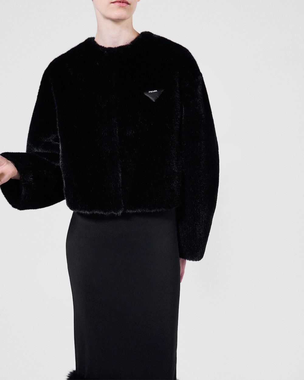 柔らかでエレガントなアスペンのボクシージャケット。素材の光沢が繊細な光の陰影を生み出し、洗練されたモダンな表情を与えています。コントラストの効いた素材のトライアングルロゴが現代的なアクセントを添えています。