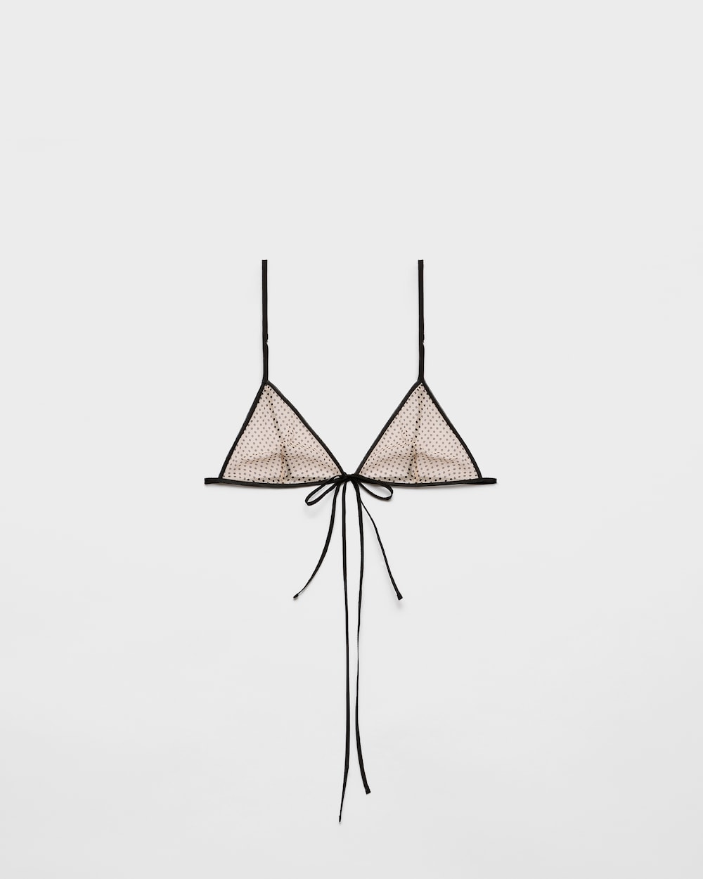 ロマンティックで繊細なトライアングル型のブラ。シルクシフォンを使用し、ポルカドットプリントをあしらった洗練されたデザイン。