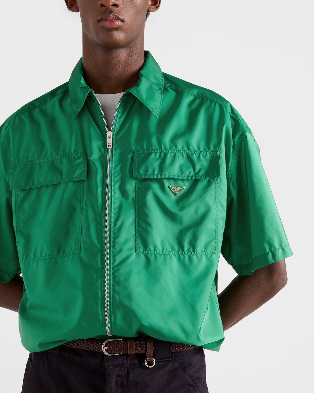 ユーティリティスタイルのディテールと、スポーティなエレメントが融合した、現代的でミニマルなデザインの半袖シャツ。Re-Nylonの軽やかなシルエットは、ボックスシルエットのラインが特徴で、前面に大きなポケットが付いています。ファスナー開閉式で実用的でシンプルな印象を与えます。エナメルメタルのトライアングルロゴがプラダらしいアイコニックで個性的な魅力を添えています。