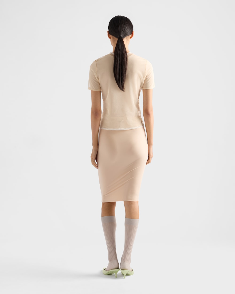 このストレッチファブリックのスリップは、スリムフィットの洗練されたペンシルシルエットです。軽量なデザインには、アイコニックなエナメルメタルトライアングルロゴが装飾されています。