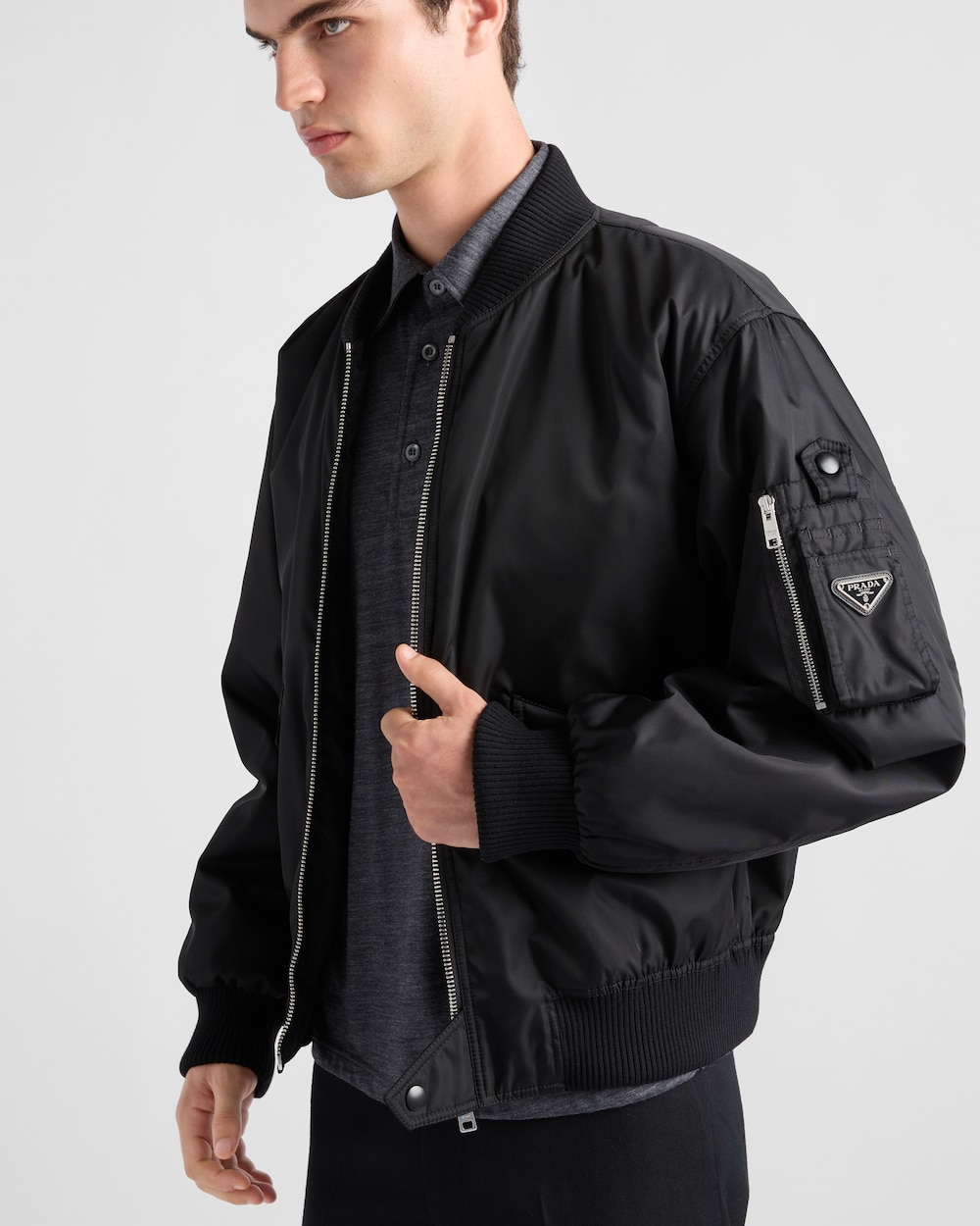 シルエットを引き立てる、柔らかなフォルムが魅力のRe-Nylonボンバージャケット。機能的なディテールと、エナメルメタルのトライアングルロゴがあしらわれています。 サスティナブルなお手入れ方法:製品の風合いを保つため、また環境への負荷を軽減するために、製品を頻繁にクリーニングすることを推奨しておりません。使用後は風通しの良い場所で陰干ししていただき、クリーニングが必要な場合は環境に配慮したクリーニング店でドライクリーニングをすることをおすすめします。