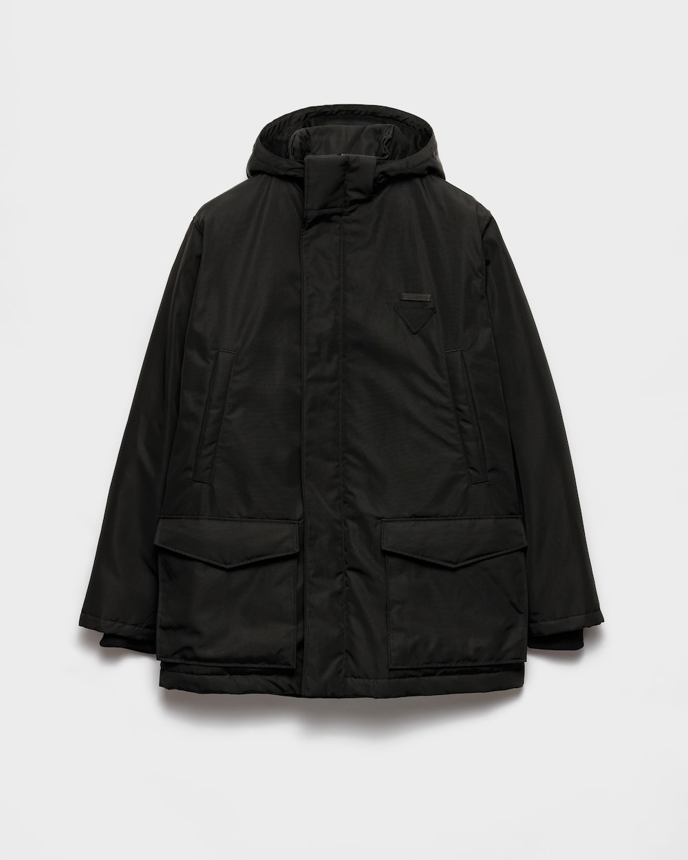テクニカルファブリックを使用したダウンジャケット。スポーティで機能的なデザインにミニマルなラインが特徴です。取り外し可能なフードで特徴付けられたスタイルは、リブ編みの袖口で仕上げられ、トーナルトライアングルロゴがアイコニックで現代的な印象を与えます。