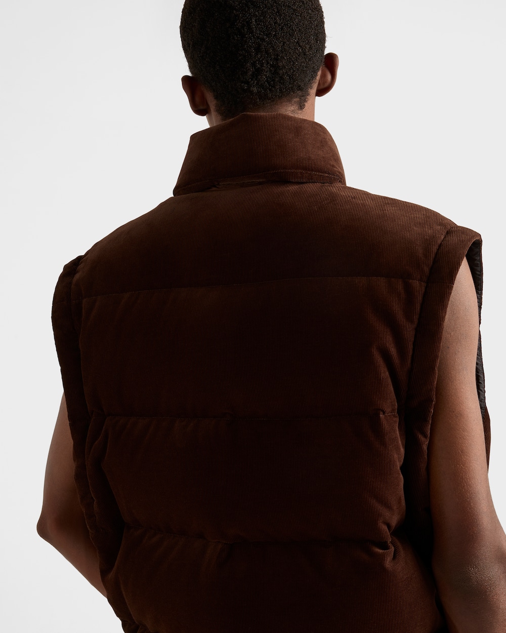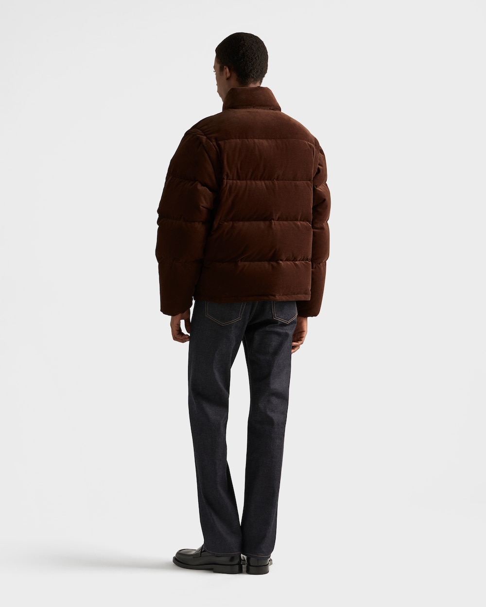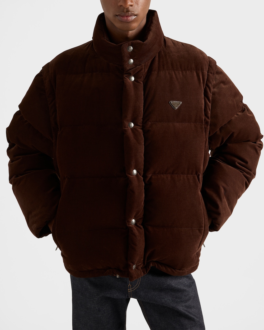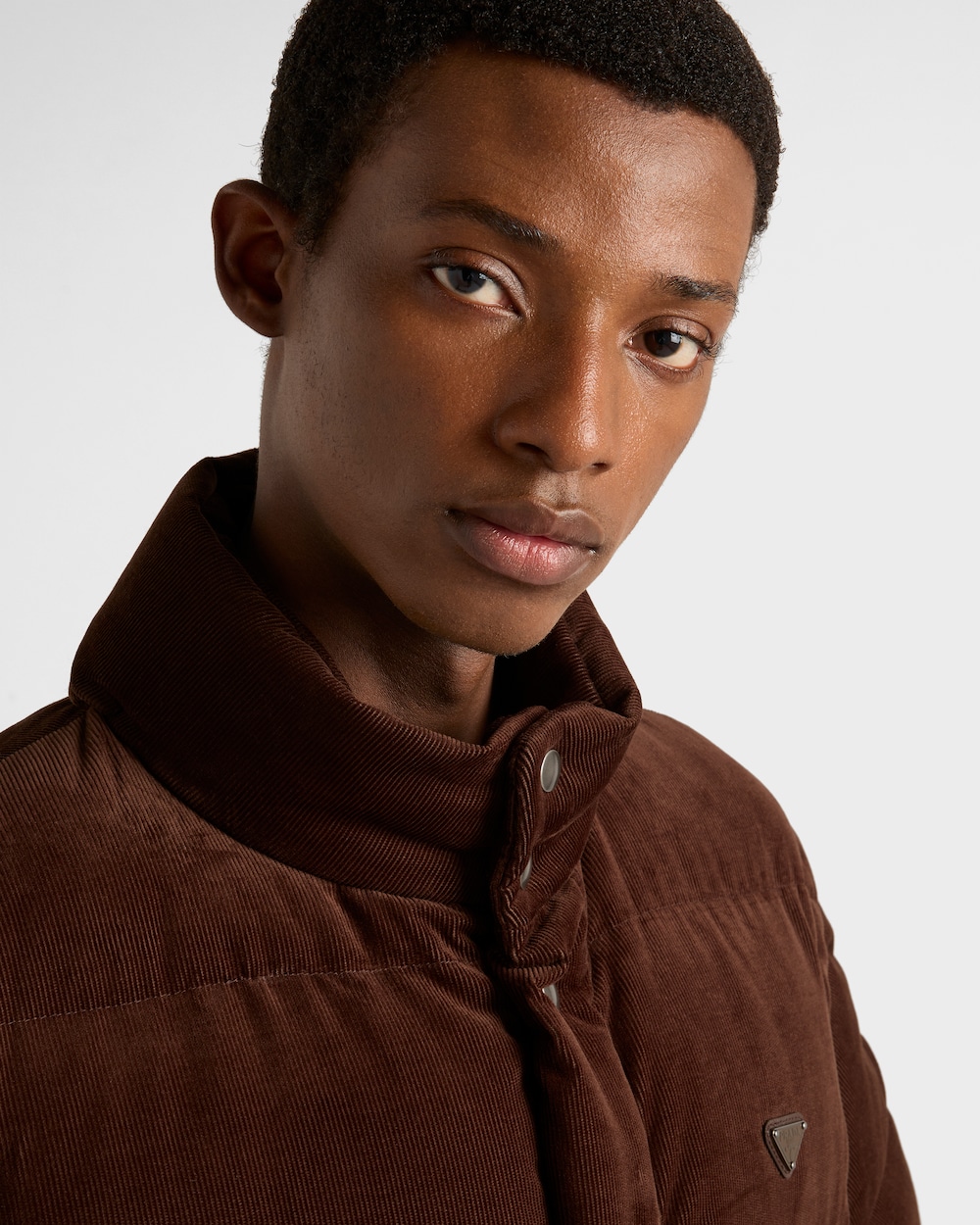 コーデュロイの柔らかな質感が、スポーティなスタイルのダウンジャケットのボリュームを引き立てます。グースダウンのパッド入りで暖かく多用途なデザインに仕上がっており、エナメルメタルトライアングルロゴがあしらわれています。