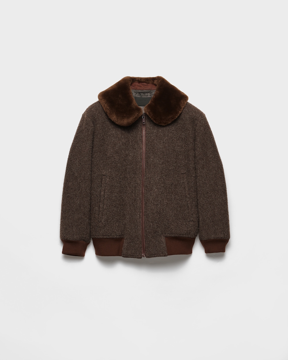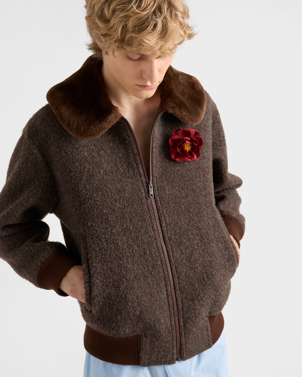 ウール ブルゾンジャケットは、カジュアルな魅力と洗練されたディテールが組み合わさっています。スポーティなシルエットに、染色と加工を施したシアリングの襟があしらわれ、柔らかく立体的な効果を生み出しています。