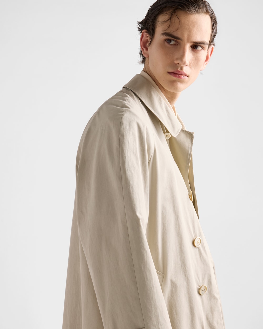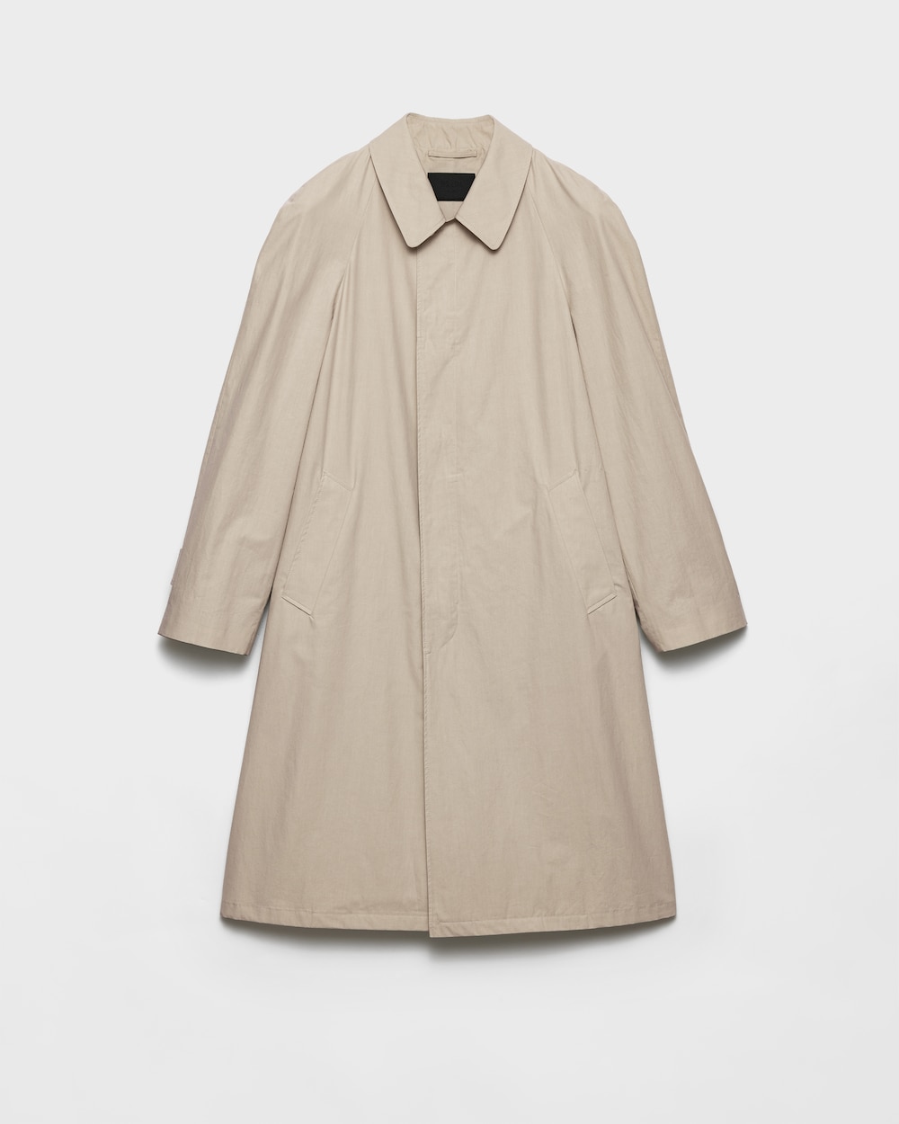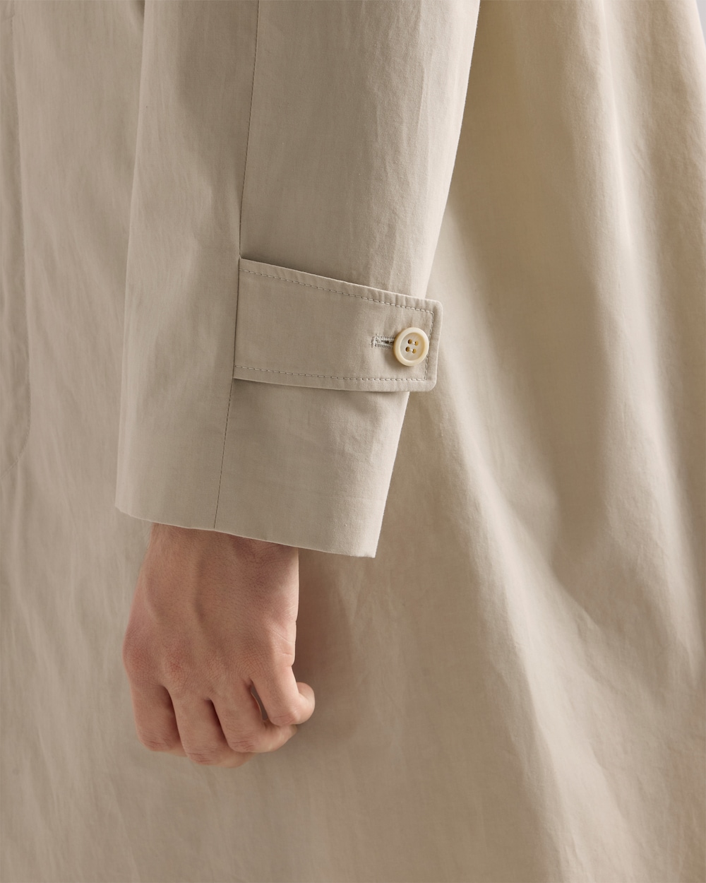 このコートは、洗練されたタイムレスなラインを持ちながら、その構造を再構築することで、カジュアルでコンテンポラリーな魅力を提案しています。このシルエットは、テーラリングの技術とダイナミックな軽やかさを融合させています。背面のベントが動きを加え、同色のトライアングルロゴで装飾されたデザインを引き立てています。