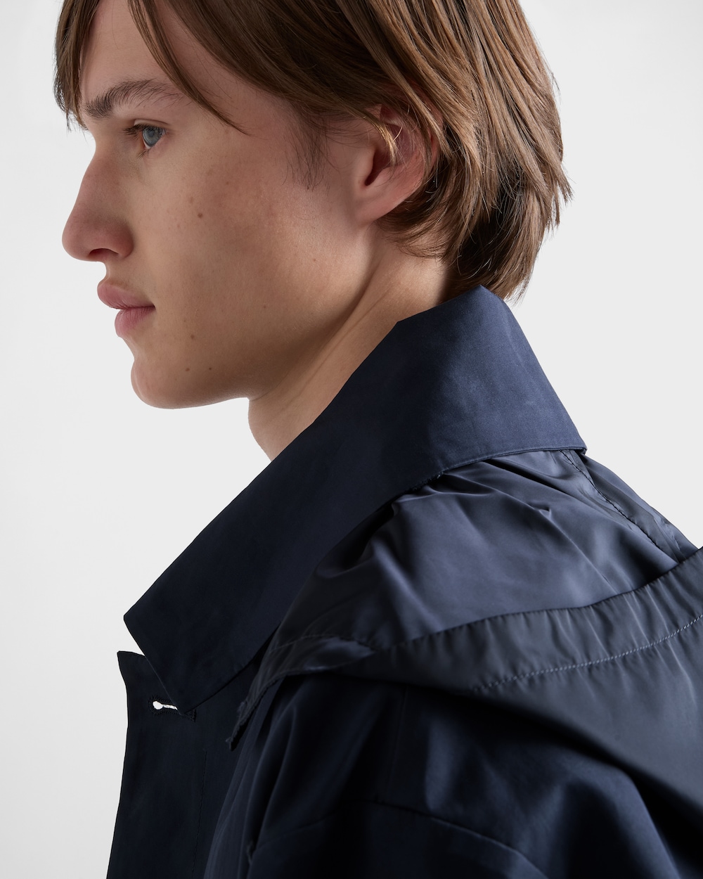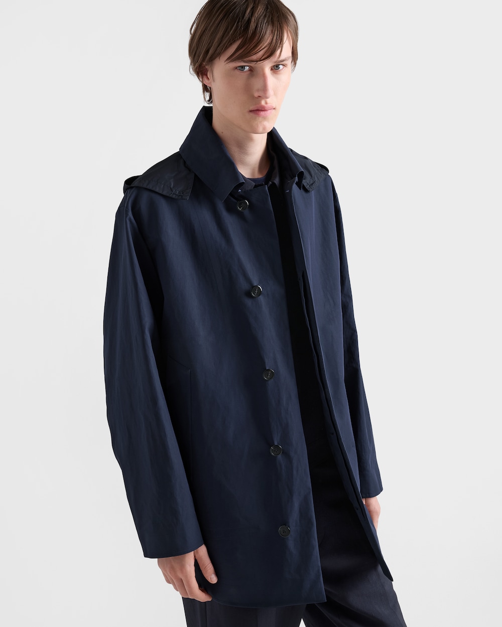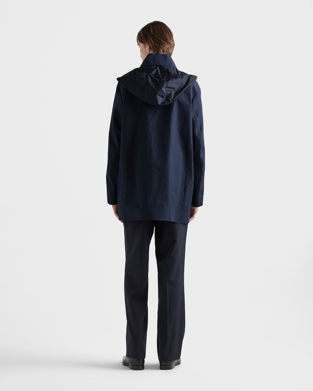 プラダのメンズコレクションを特徴づけるサルトリアルカットの精密さが、モダンな精神を持つこのフード付きコットンジャケットに見られます。スポーツの要素とクラフトマンシップを融合し、このウェアはメンズの新しいスタイルコンセプトの象徴となりました。