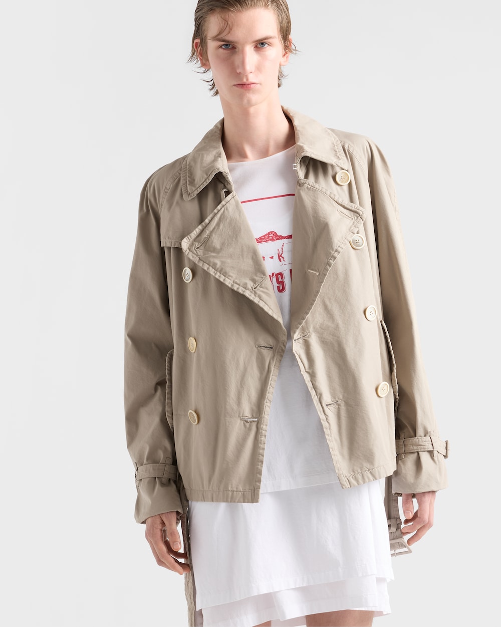 コントラストの研究からインスピレーションを得たこのジャケットは、ハイブリッドな個性を持ち、伝統的なかっちりとした造りのシルエットを新たな軽やかさで再解釈しています。スタイルは、ヴィンテージ加工によってウェアに奥行きと個性を与えています。