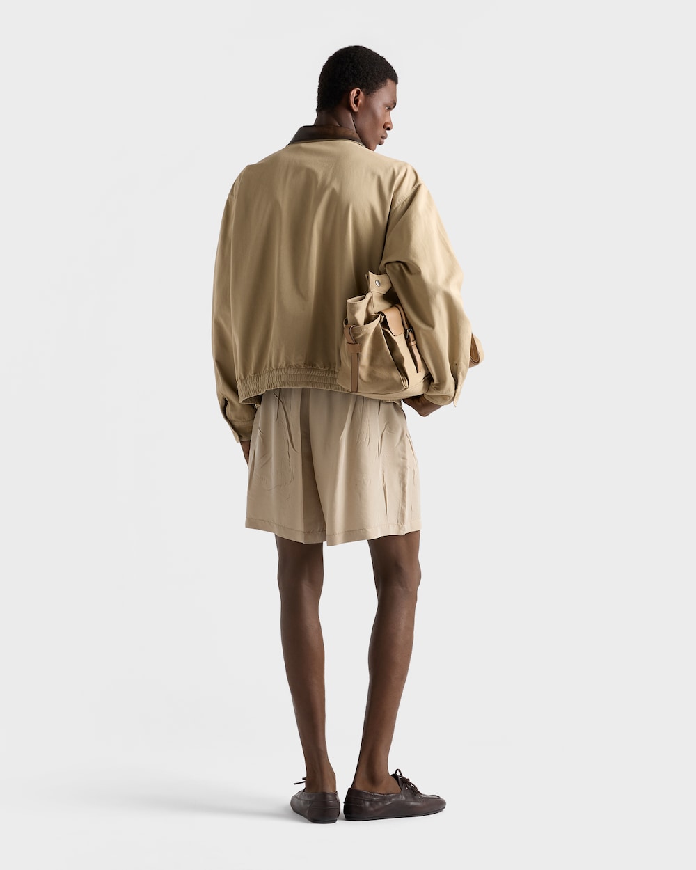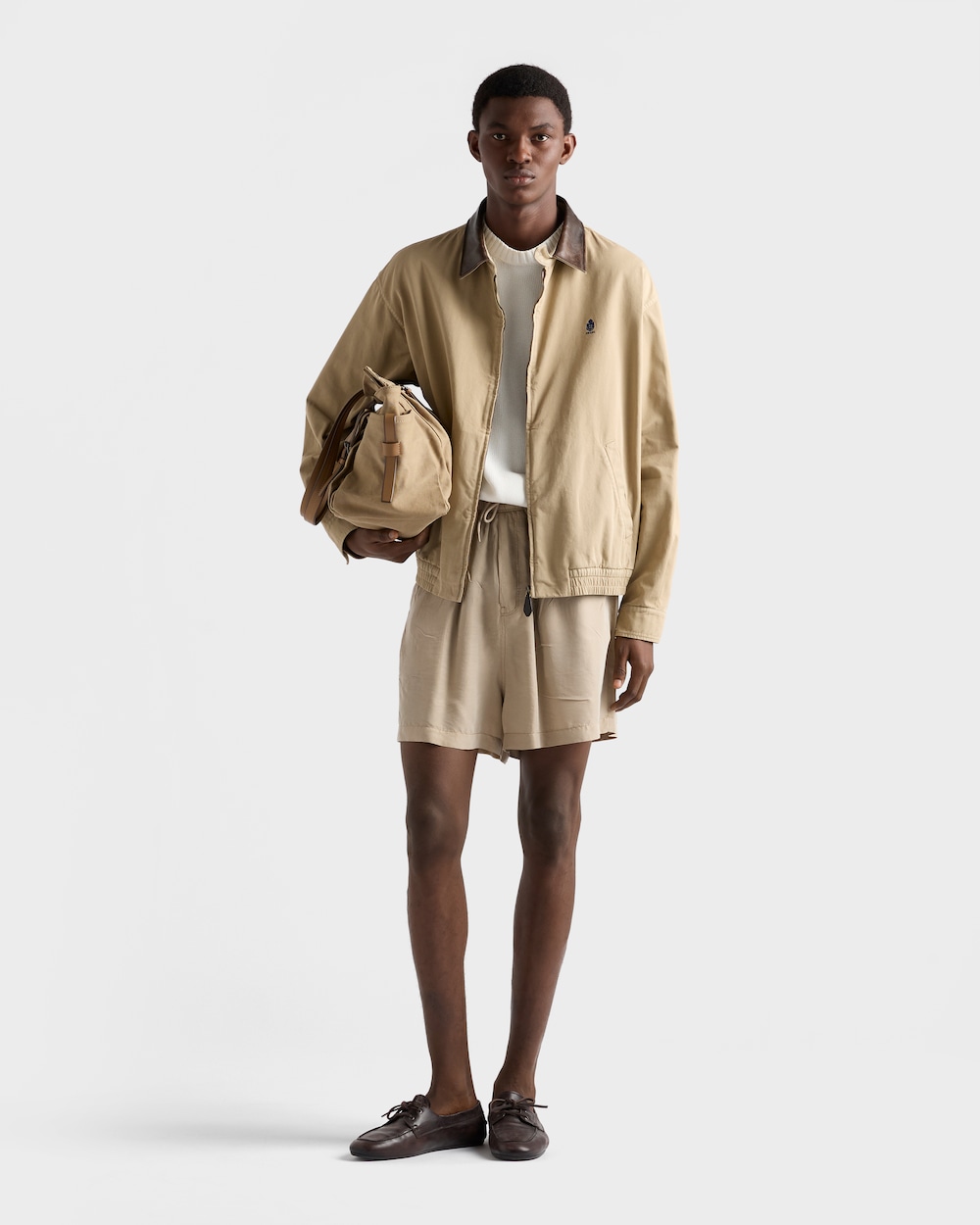 コットンの軽やかさとレザーディテールの強さが融合したハイブリッドデザインが、プラダの二元性の精神を体現しています。これは、独特なライフスタイルの特徴を持つ夏のシーズンへの新しいアプローチです。