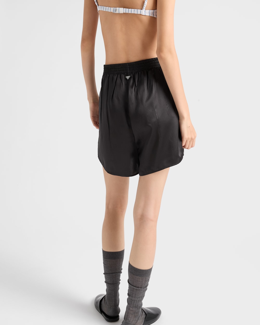 光沢感のあるサテンが、ミニマルなデザインと美しく融合しています。ボタン付きのエラスティックウエストバンドは、機能的な斜めポケットと組み合わされ、エナメルメタルのトライアングルロゴがアクセントを添える、特徴的で洗練されたディテールです。