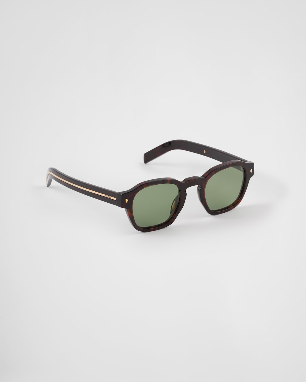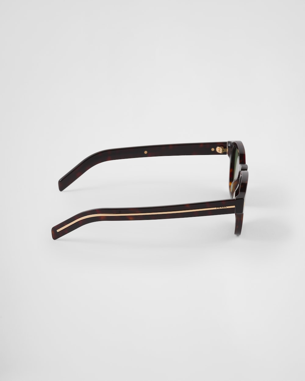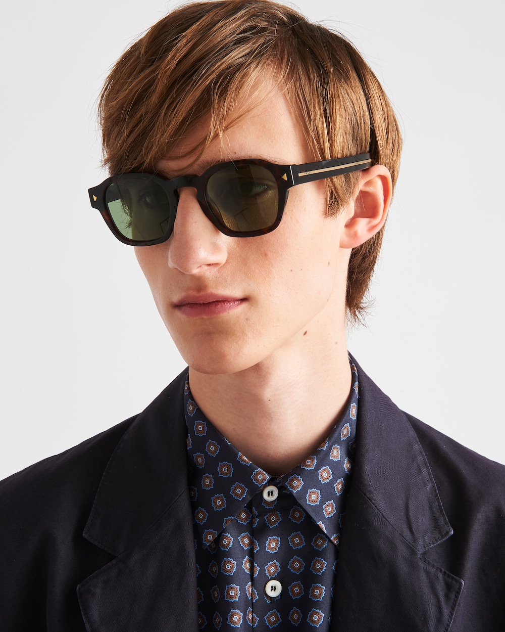 カジュアルなエレガンスが薫るアセテートサングラス。上品なトライアングルの鋲(びょう)が特徴的なパントス型のフロント。テンプルのアイコニックなメタルプラークには、プラダのレタリングロゴがあしらわれています。