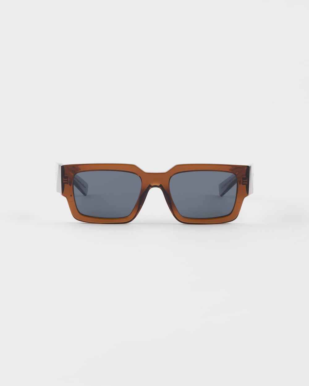 現代的なスクエアデザインのアセテートサングラス。太いリムの大きなフロントに、プラダのレタリングロゴで装飾された独特の三次元加工が施されたファセットテンプルを組み合わせています。いくつかのカラーバリエーションでは、リム部分にコントラストカラーを効かせたアセテート層の組み合わせが特徴です。