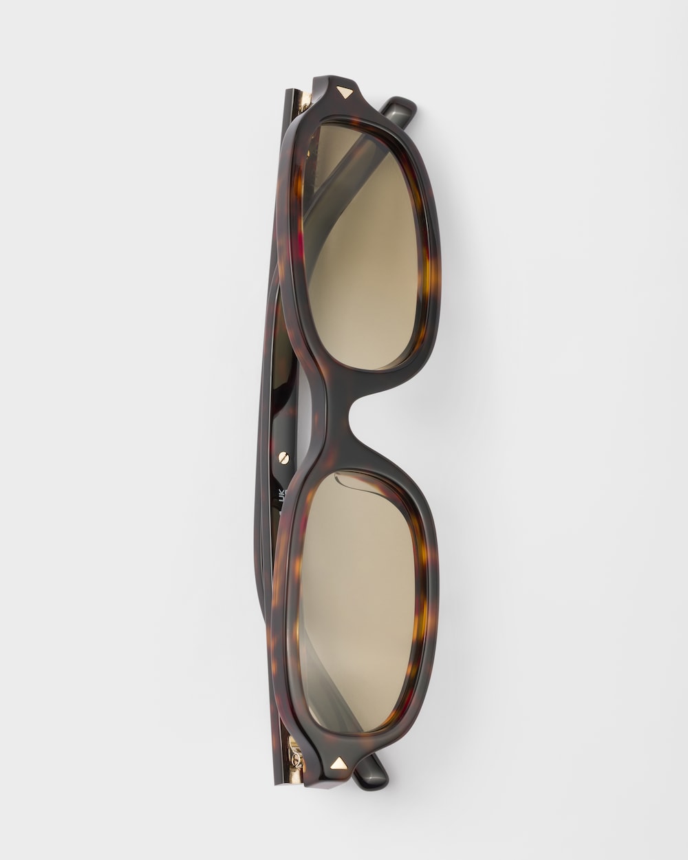 洗練されたオーバルデザインのアセテートサングラス。フレームはクリーンなラインと洗練されたディテールを兼ね備え、テンプルにはプラダのレタリングロゴが施されたアイコニックなメタルプレートがあしらわれています。