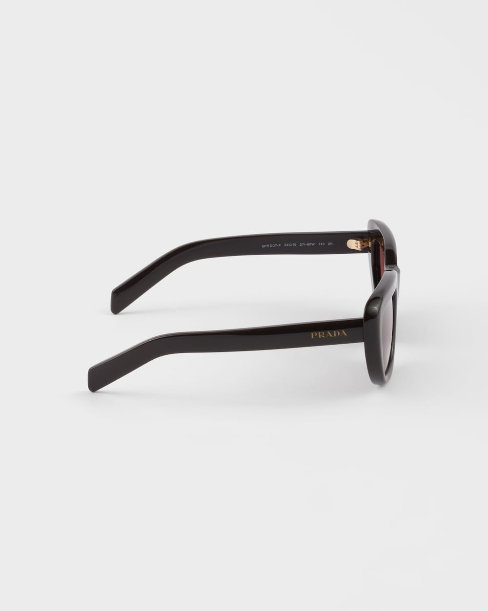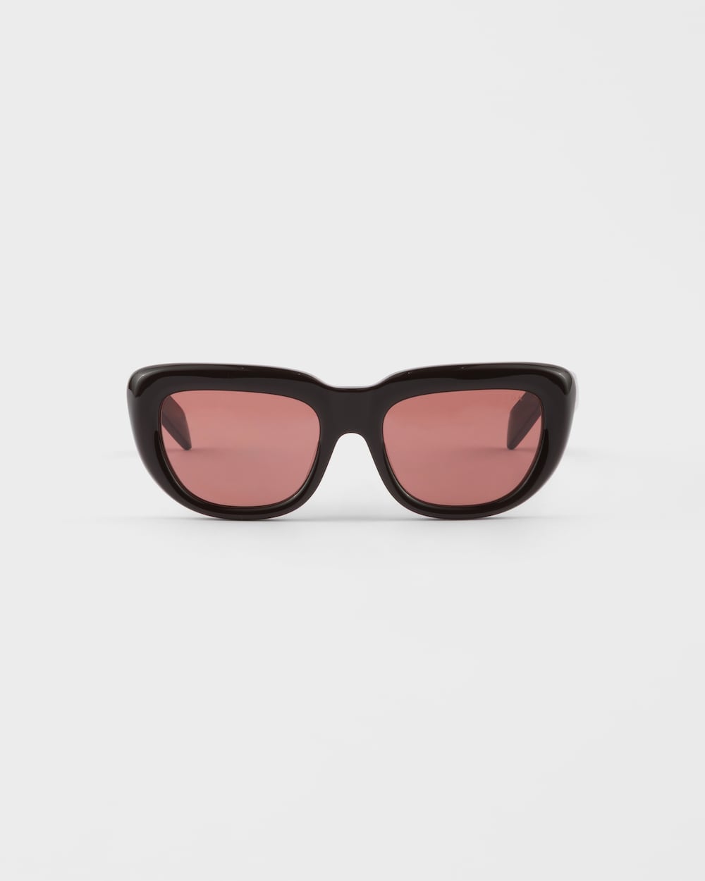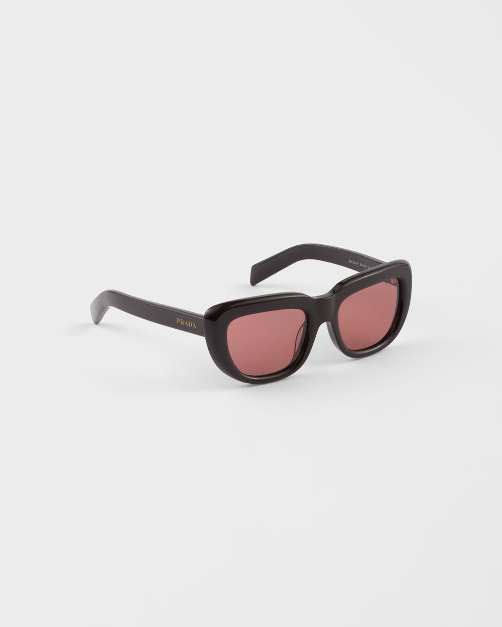 アセテート製の長方形デザインのサングラス。オーバーサイズのフレームは、ボリューム感のある厚みと柔らかな曲線が特徴で、現代的でエレガントな魅力を添えています。カーブしたテンプルにはエナメルのプラダロゴが装飾されています。