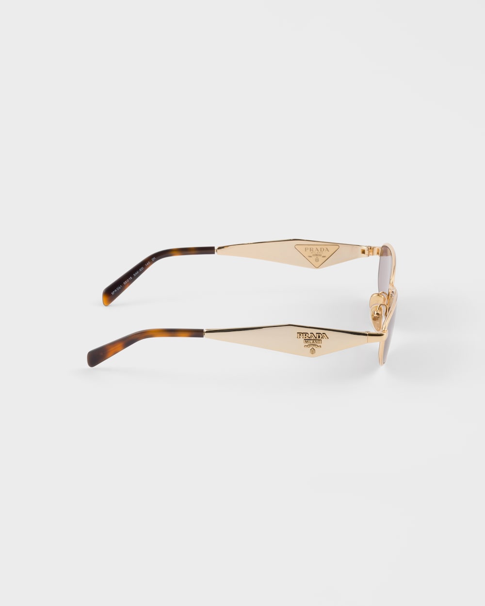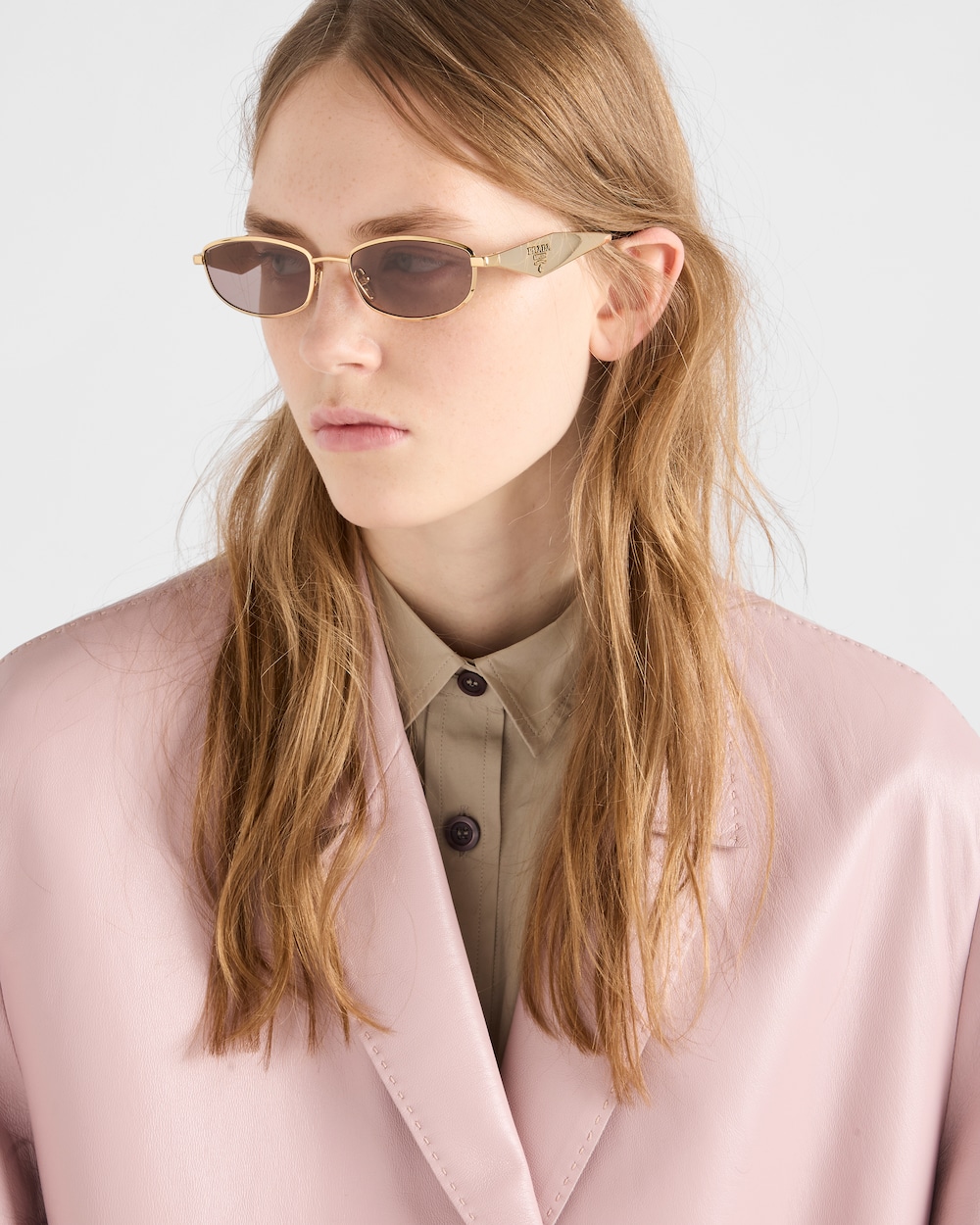洗練されたオーバルシルエットが現代的なミニマリズムを想起させるメタルサングラス。フロントは細いリムで縁取られ、幾何学的なテンプルと組み合わせられています。外側にはプラダのロゴがレリーフで装飾され、内側にはアイコニックなプラダ トライアングルロゴが繊細に刻まれています。