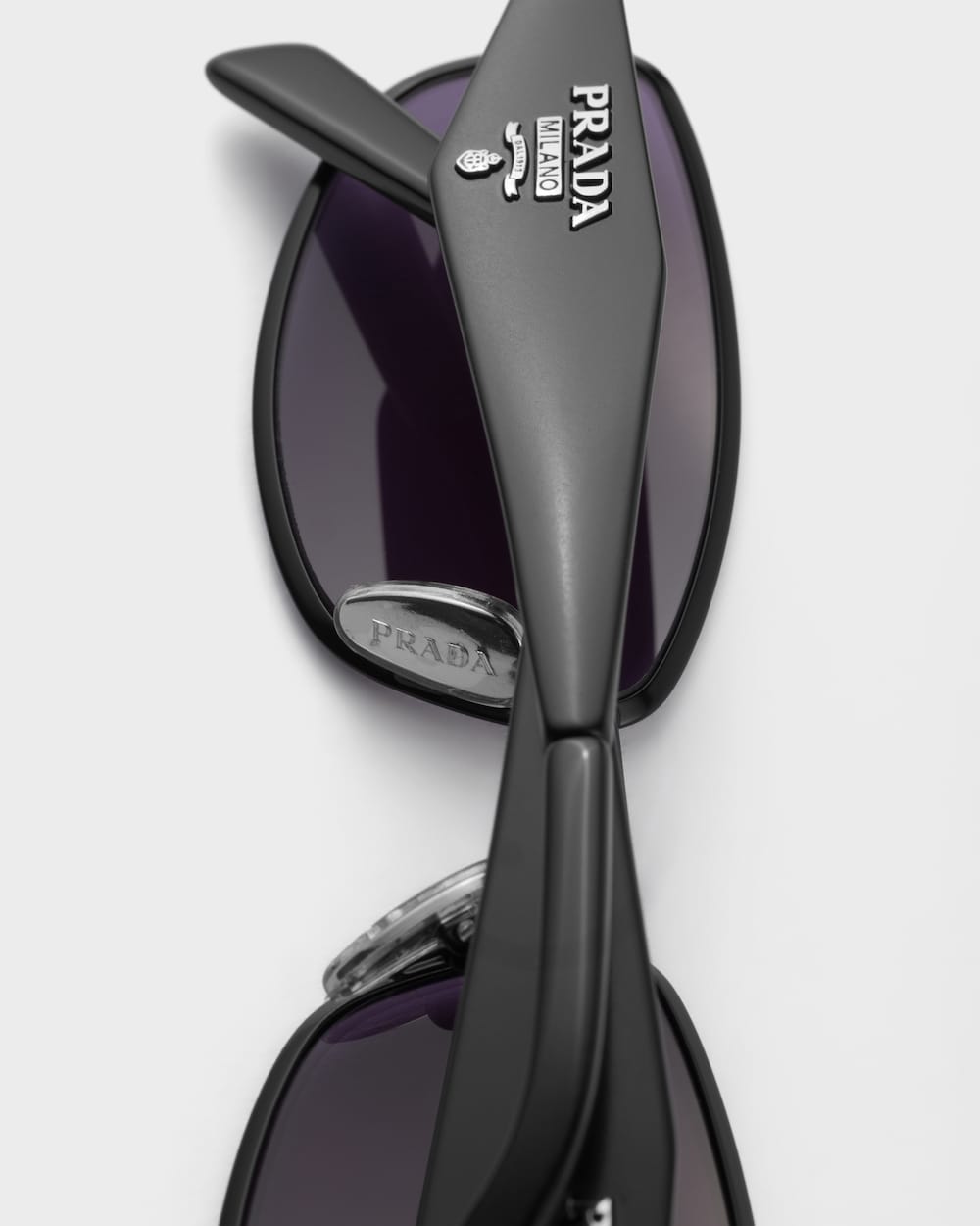洗練されたオーバルシルエットが現代的なミニマリズムを想起させるメタルサングラス。フロントは細いリムで縁取られ、幾何学的なテンプルには外側にプラダのロゴがレリーフで装飾され、内側にはアイコニックなプラダ トライアングルロゴが繊細に刻まれています。