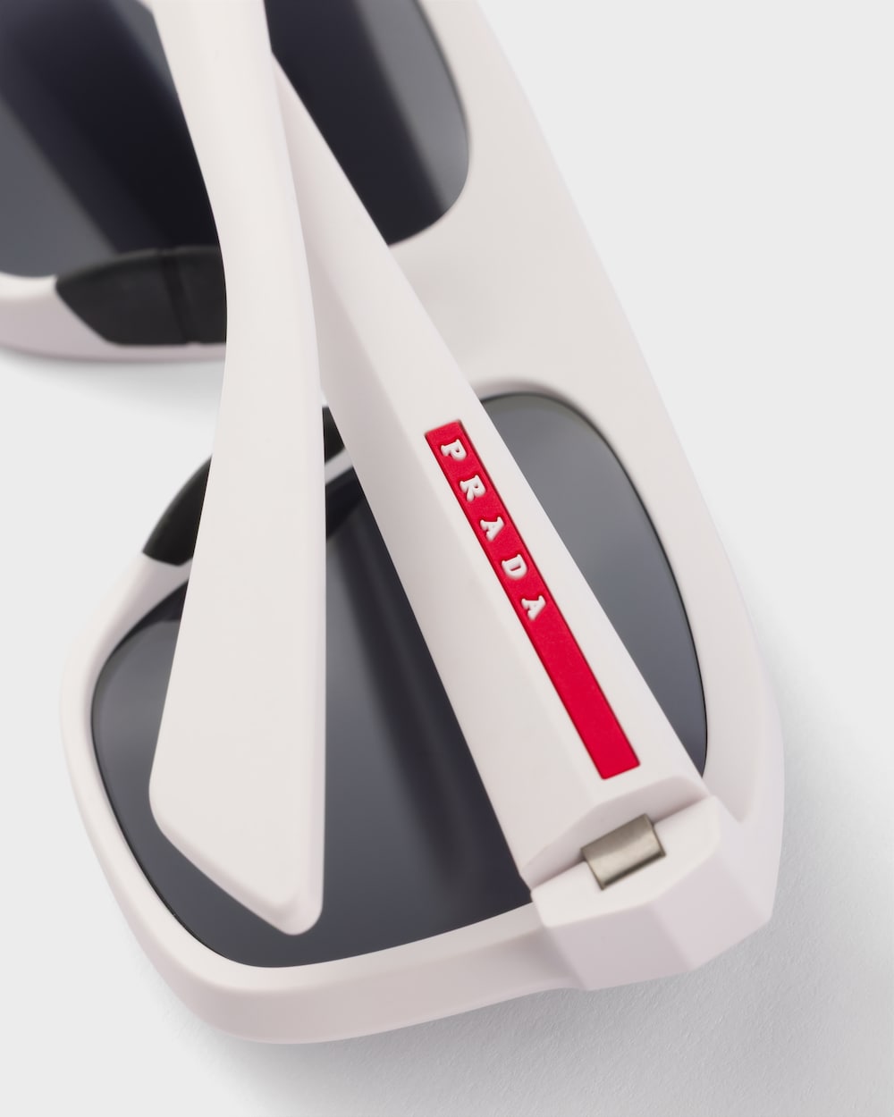 超軽量ナイロンファイバー製のサングラス、大胆な長方形デザイン。フレームは、大きめのサイズとわずかにカーブしたフロント、そして力強いラインが特徴です。ストレートなテンプルがブランドのスポーティーな美学を際立たせ、アイコニックなリネア・ロッサがアクセントとしてあしらわれています。