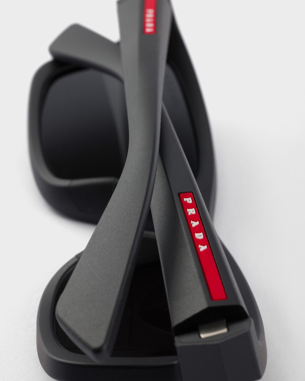 ウルトラライトナイロンファイバーのサングラス、長方形デザイン。フレームは、曲線と厚いリムが特徴のラージフロントを持っています。ストレートテンプルがブランドのスポーティな美学を強調し、アイコニックなリネア・ロッサで装飾されています。