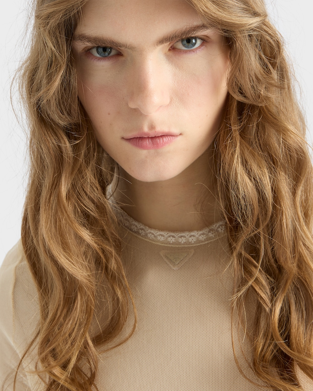 チュールの洗練された繊細さが、このライトな半袖Tシャツの特徴であるレースのトリム付きクルーネックを引き立てています。