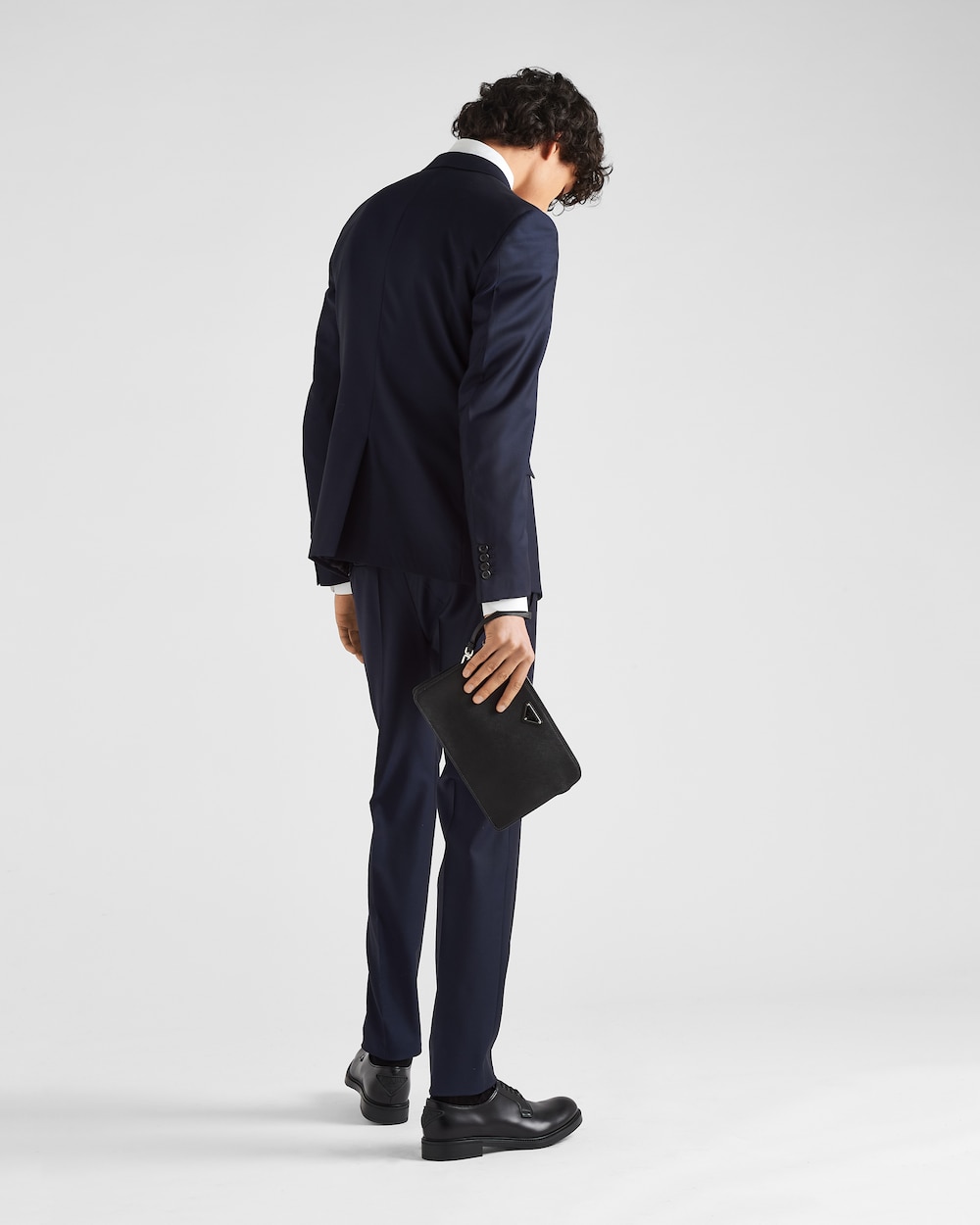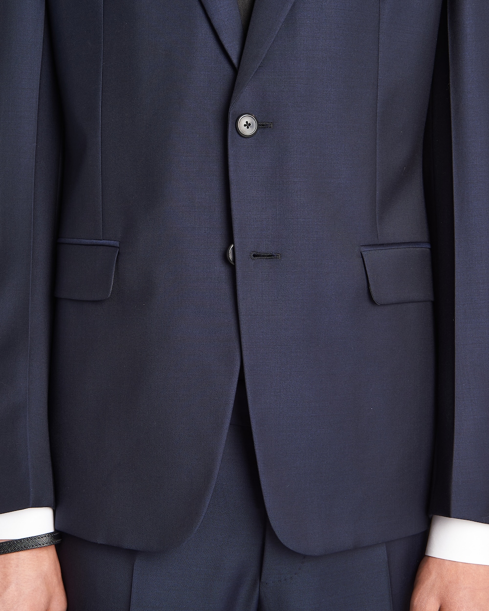 洗練されたテーラリングが光る、シングルブレストのスリムフィットスーツ。クラシックラペル、背面にベンツをあしらった2つボタンジャケット。パンツのフロントに斜めスラッシュポケット、背面にウェルトポケットを施したデザイン。