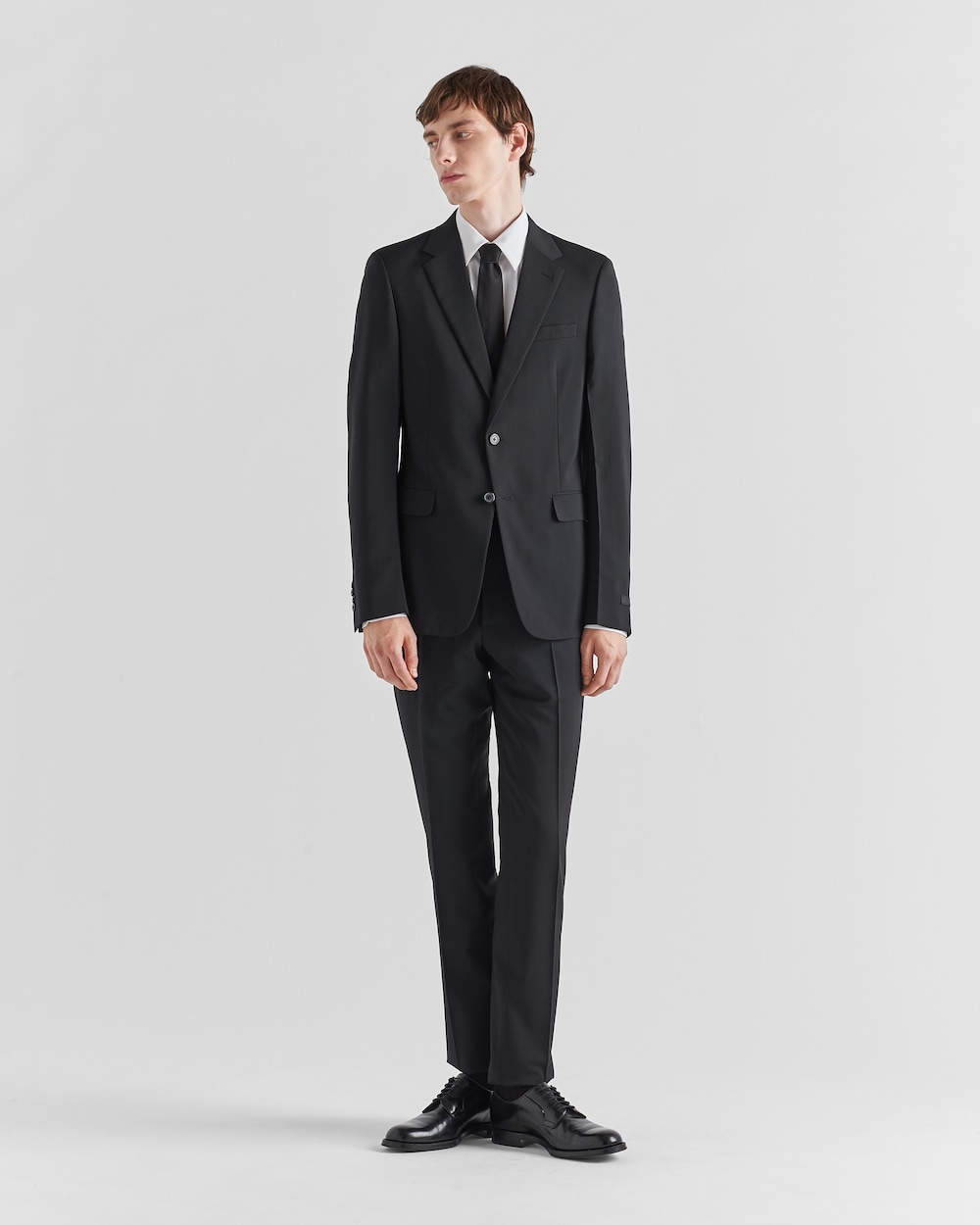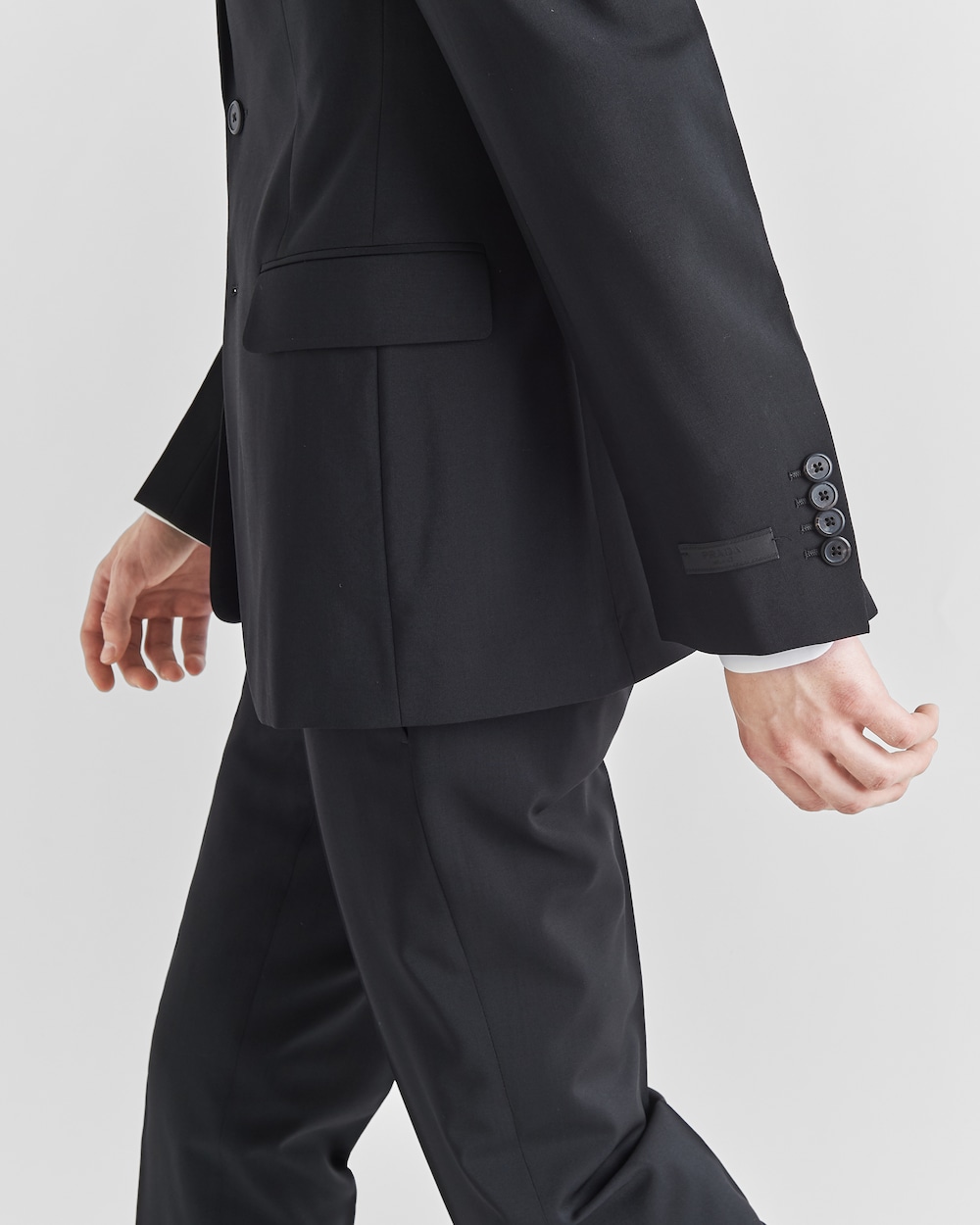 ブラックの柔らかいウールとモヘアを使い、スリムフィットとすっきりしたラインでイタリアンスタイルを表現したスーツ。ブレザーのコンストラクトショルダーとパンツのスラッシュポケットが特徴です。