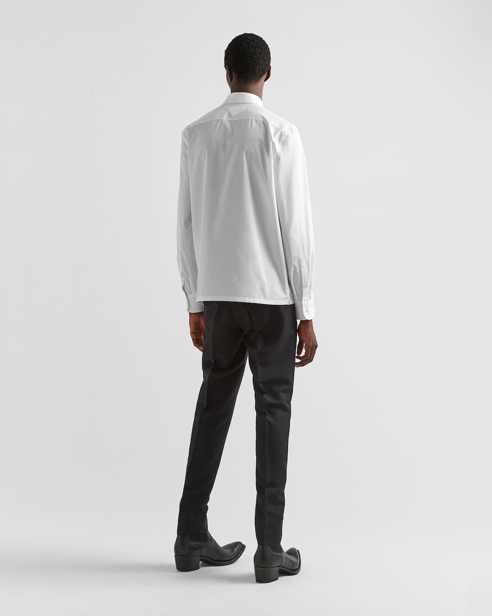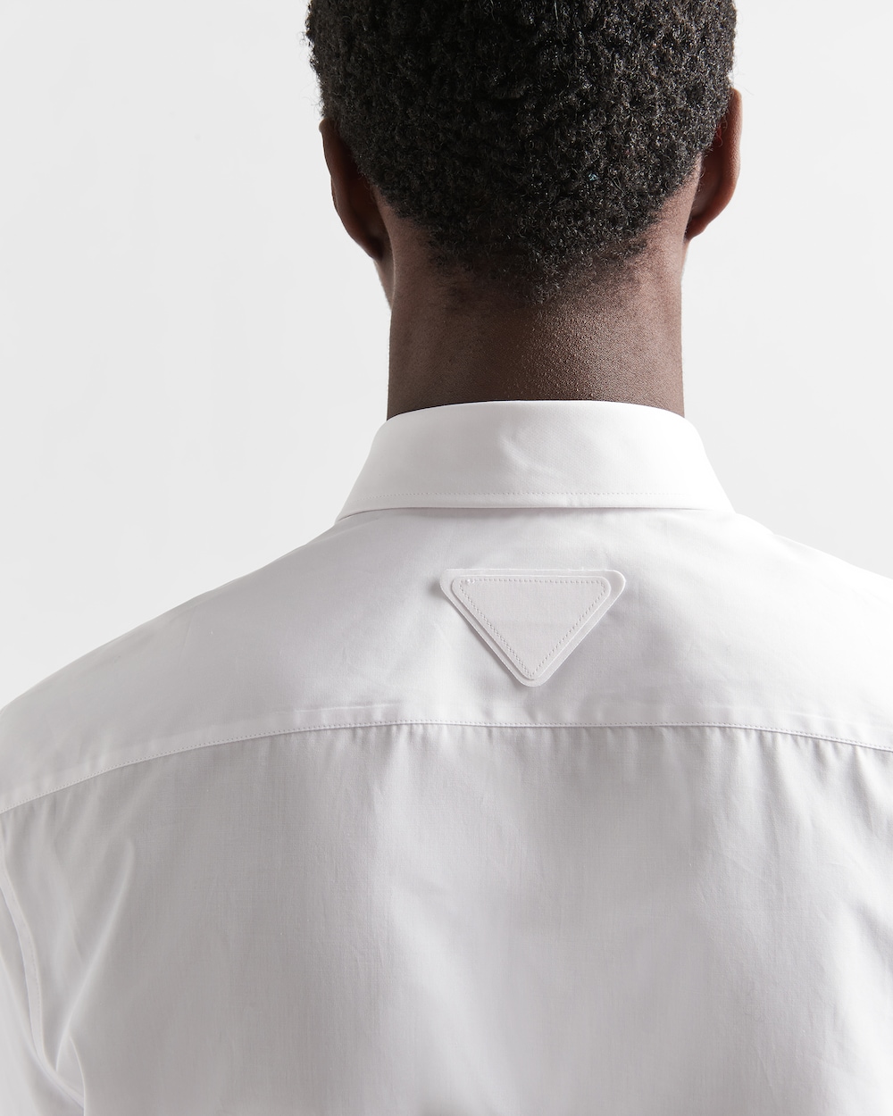 タイムレスな魅力をたたえる、ストレートなシルエットのコットンシャツ。クラシックスタイルの襟とくるみボタンを配した前あき。背面にファブリックのトライアングルロゴパッチをあしらい、オリジナリティをプラスしました。