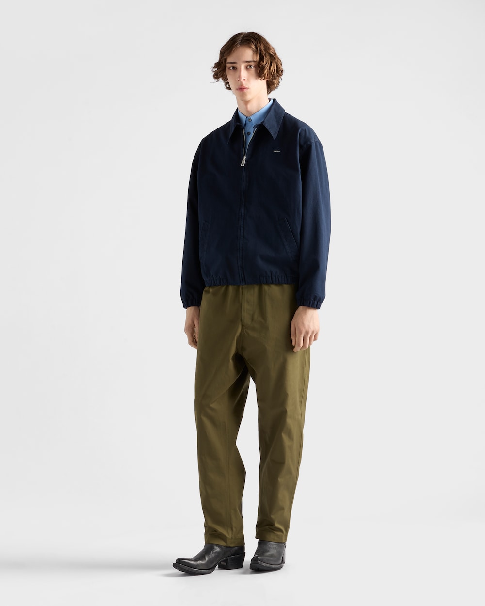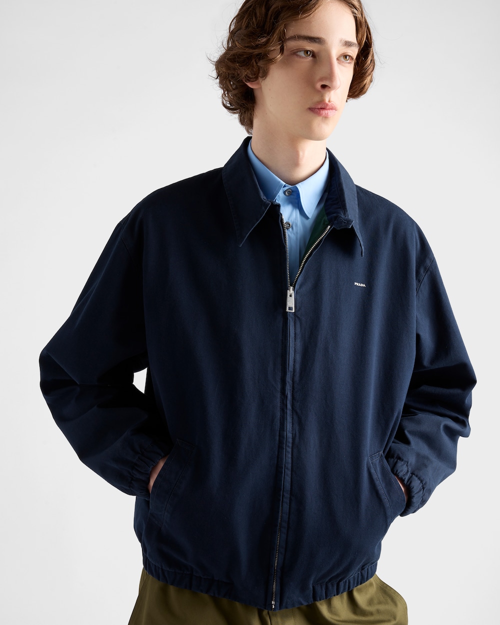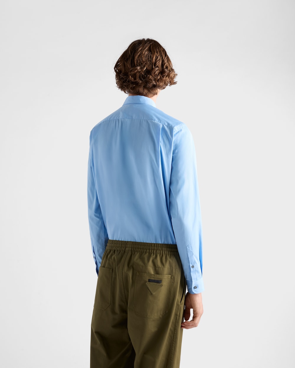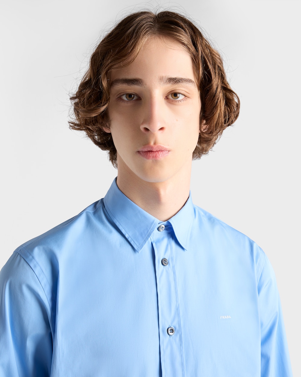 このコットンシャツはクラシックなカットが特徴で、ラウンドヘムとマザーオブパールボタンがあしらわれています。前身頃の刺繍レタリングロゴが洗練された印象を添えています。