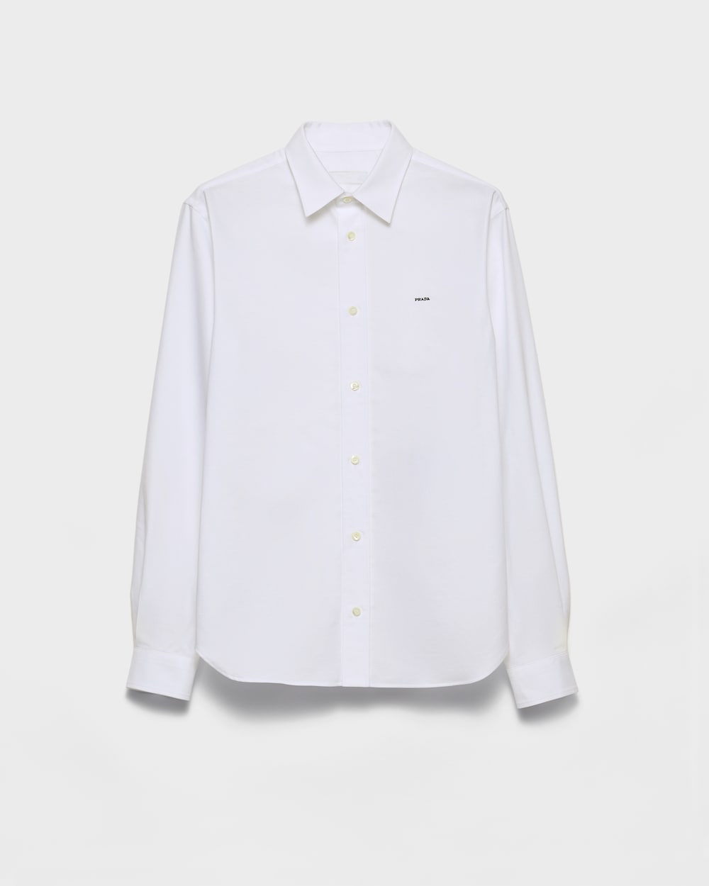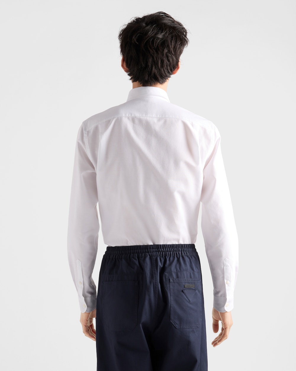 このコットンシャツはクラシックなカットが特徴で、ラウンドカットの裾と隠しボタンの前立てが施されています。フロントに刺繍されたレタリングロゴが、洗練されたアクセントになっています。