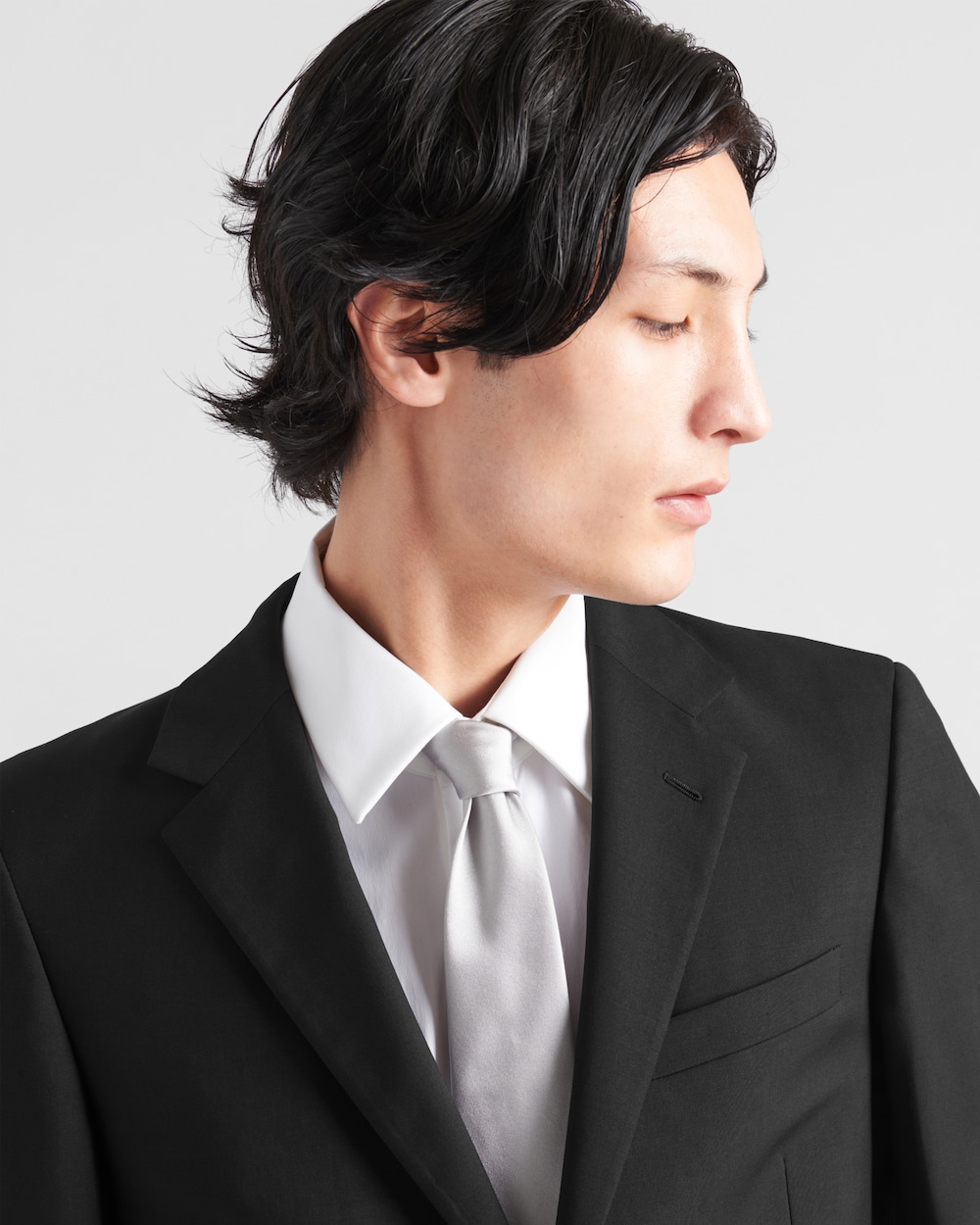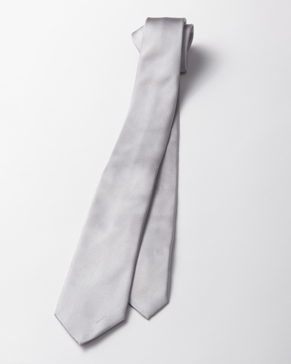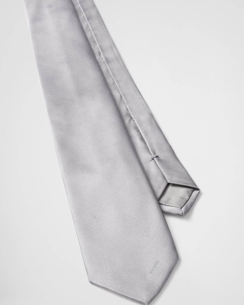 上品なモノクロの色合いが特徴のサテン ネクタイ。控えめなレタリングロゴの刺繍が施されています。