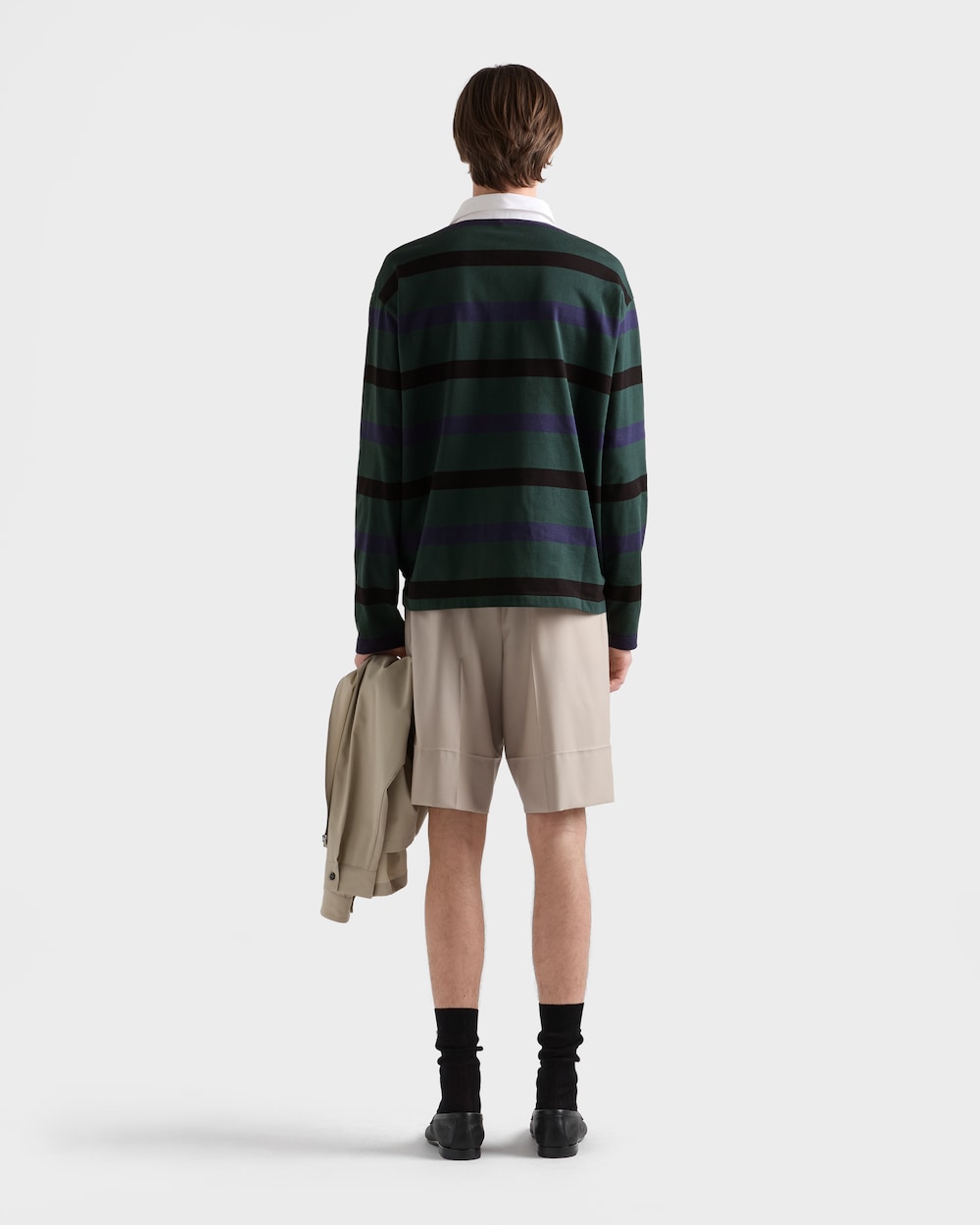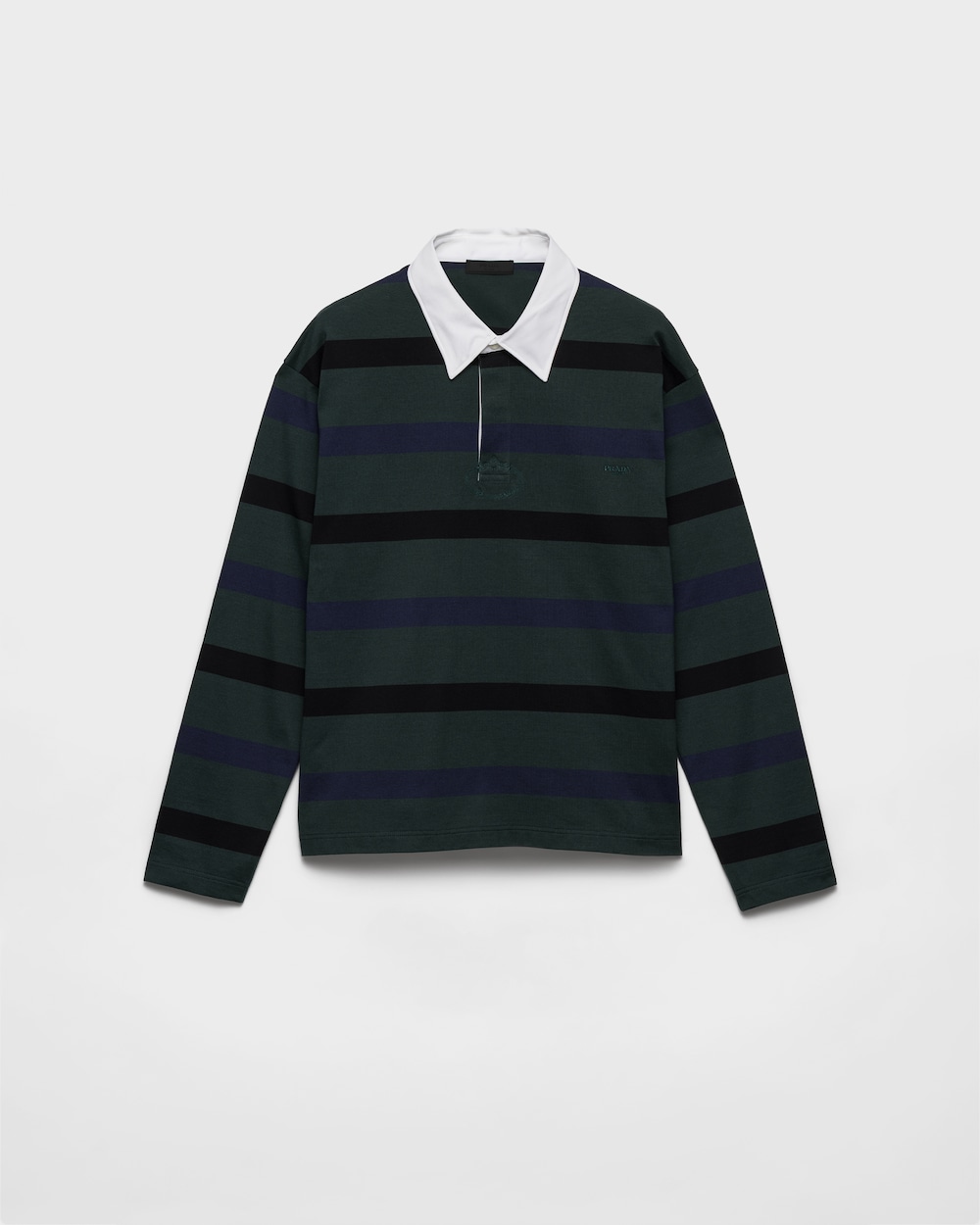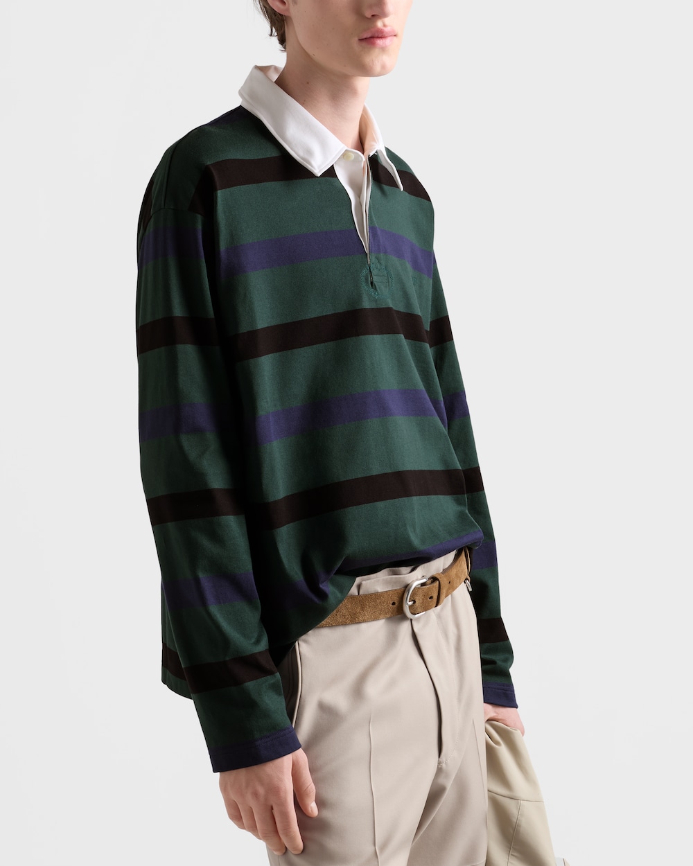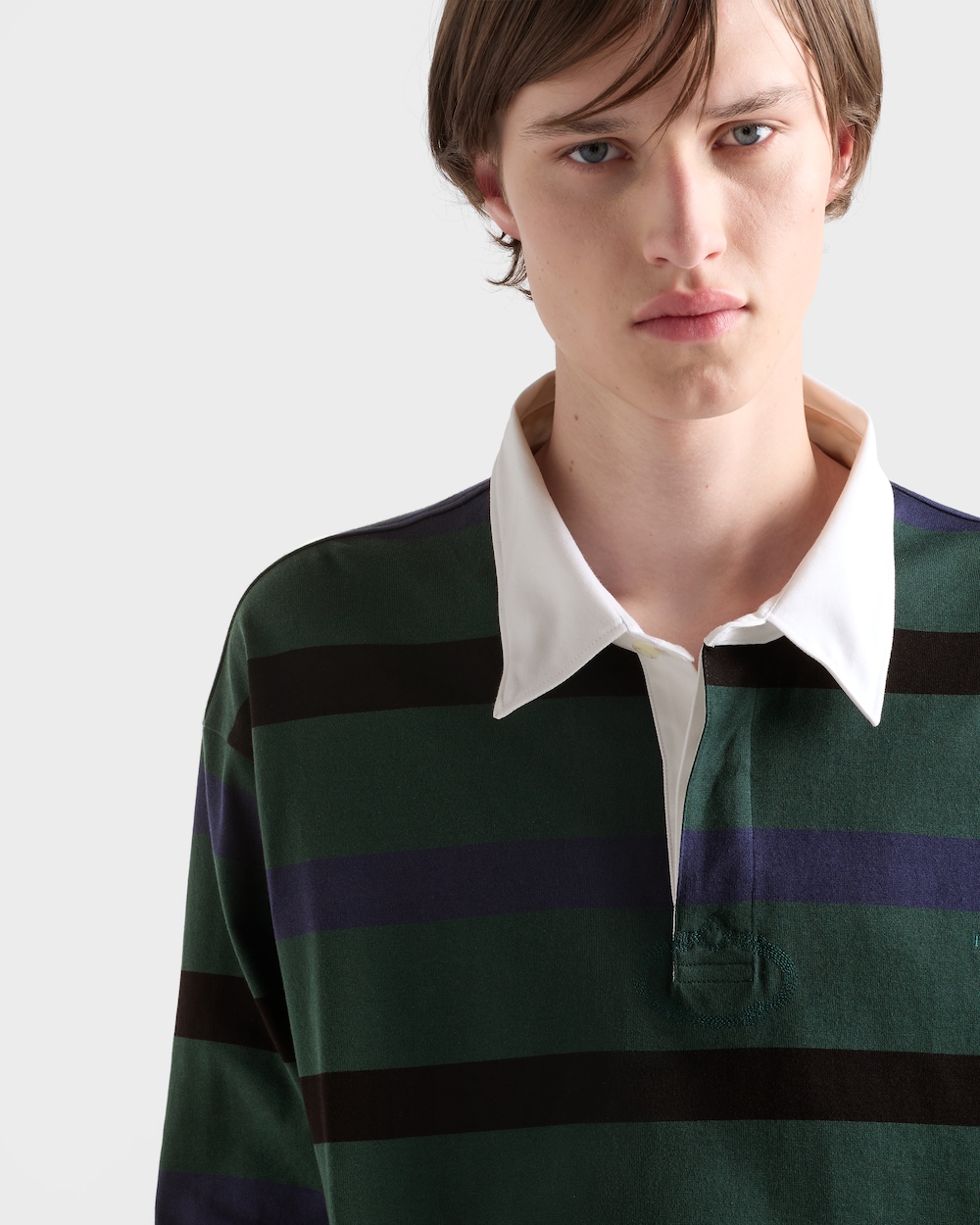長袖コットンポロシャツは、レトロな雰囲気を漂わせるカジュアルスタイルを体現しています。ストライププリントがオーバーサイズスタイルを彩り、ポプリンシャツスタイルの襟が意外性のあるアクセントを添えています。