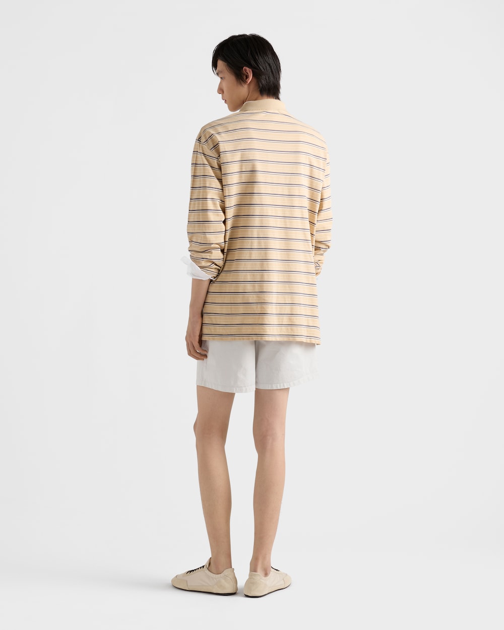 ストライプコットンピケのリラックスフィットでカジュアルなキャラクターのポロシャツ。軽やかなデザインとレトロな魅力を備え、コントラストカラーのエンブロイダリーロゴで彩られたこのスタイルは、伝統と現代的感性の調和を体現しています。