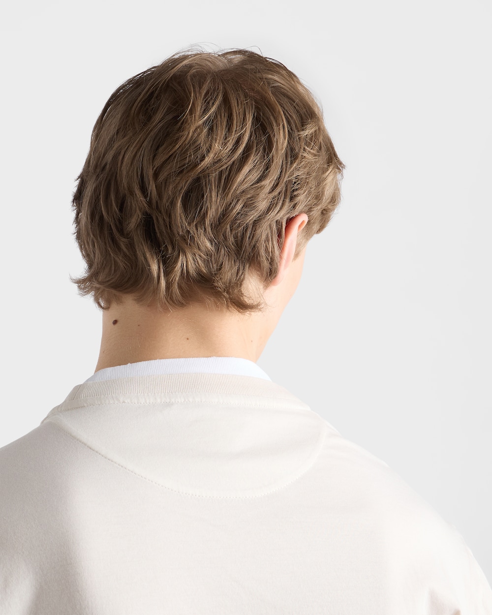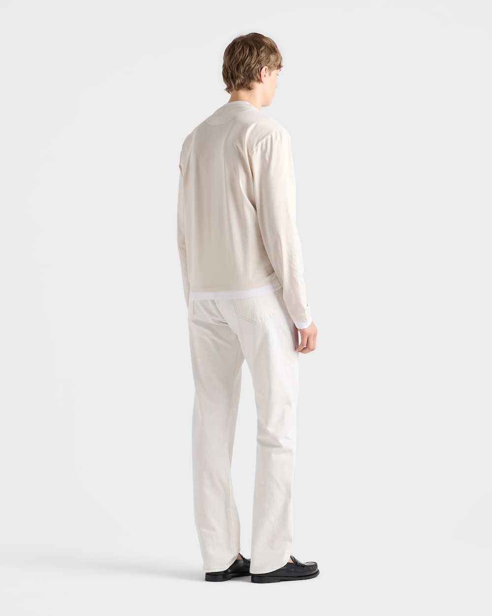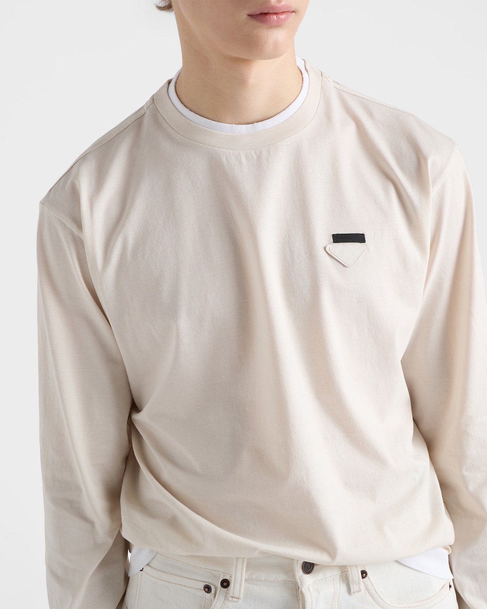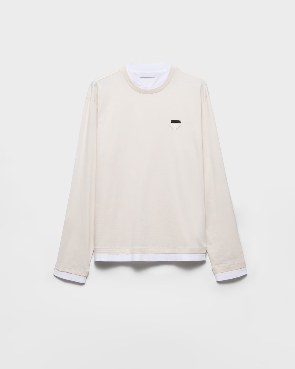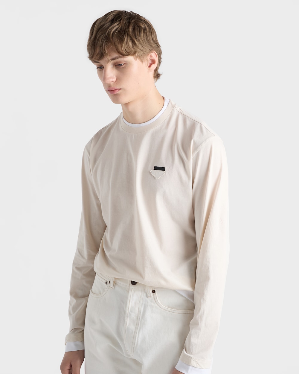 コットンTシャツは、クラシックなシルエットにスポーティで現代的な魅力を加えるレイヤリングで再解釈されています。ボックスシルエットの長袖スタイルに、コントラストの効いたジャージーのディテールを加え、象徴的なファブリックのトライアングルロゴをあしらいました。