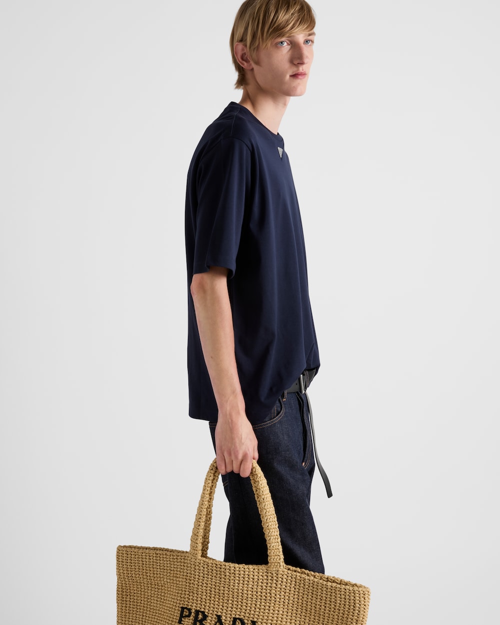 クルーネックをリブ編みで仕上げた、オーバーサイズフィットの半袖コットンTシャツ。前身頃にアイコニックなエナメルメタルのトライアングルロゴがあしらわれています。