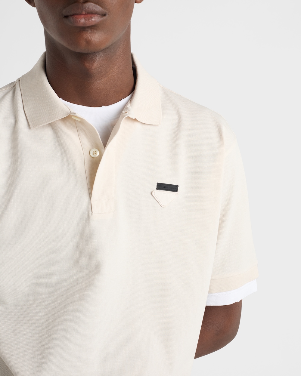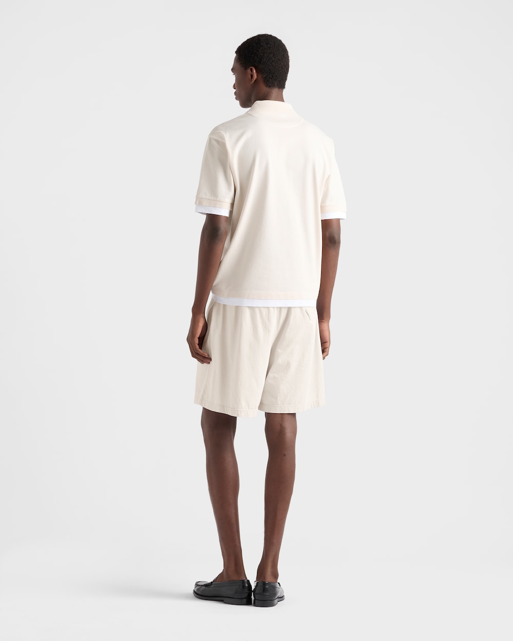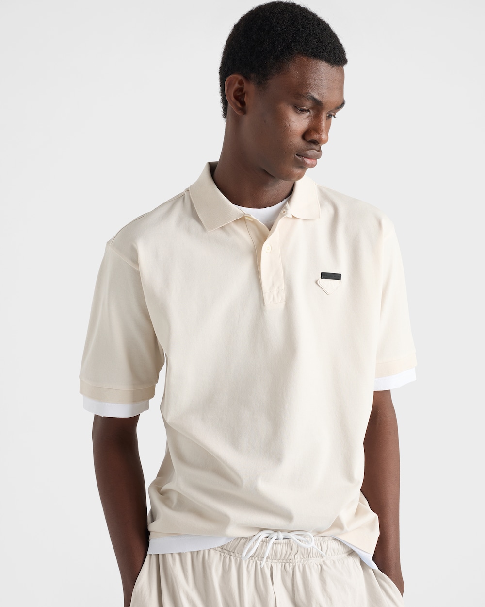 コットンポロシャツは、クラシックなシルエットにスポーティで現代的な魅力を加えるレイヤードデザインで再解釈されています。ボックスシルエットの半袖スタイルに、コントラストの効いたジャージーのディテールを加え、象徴的なファブリックのトライアングルロゴで装飾されています。