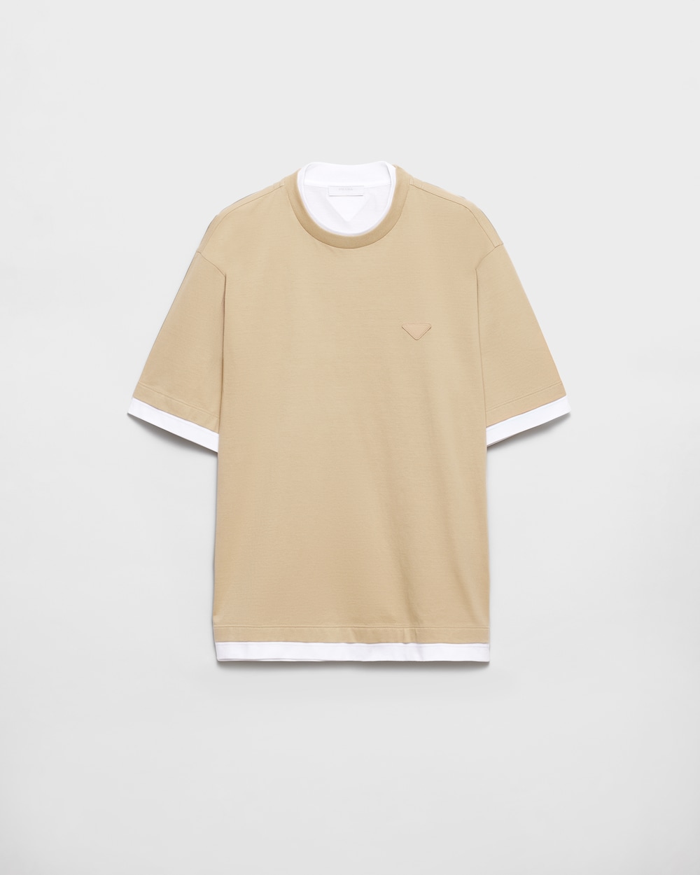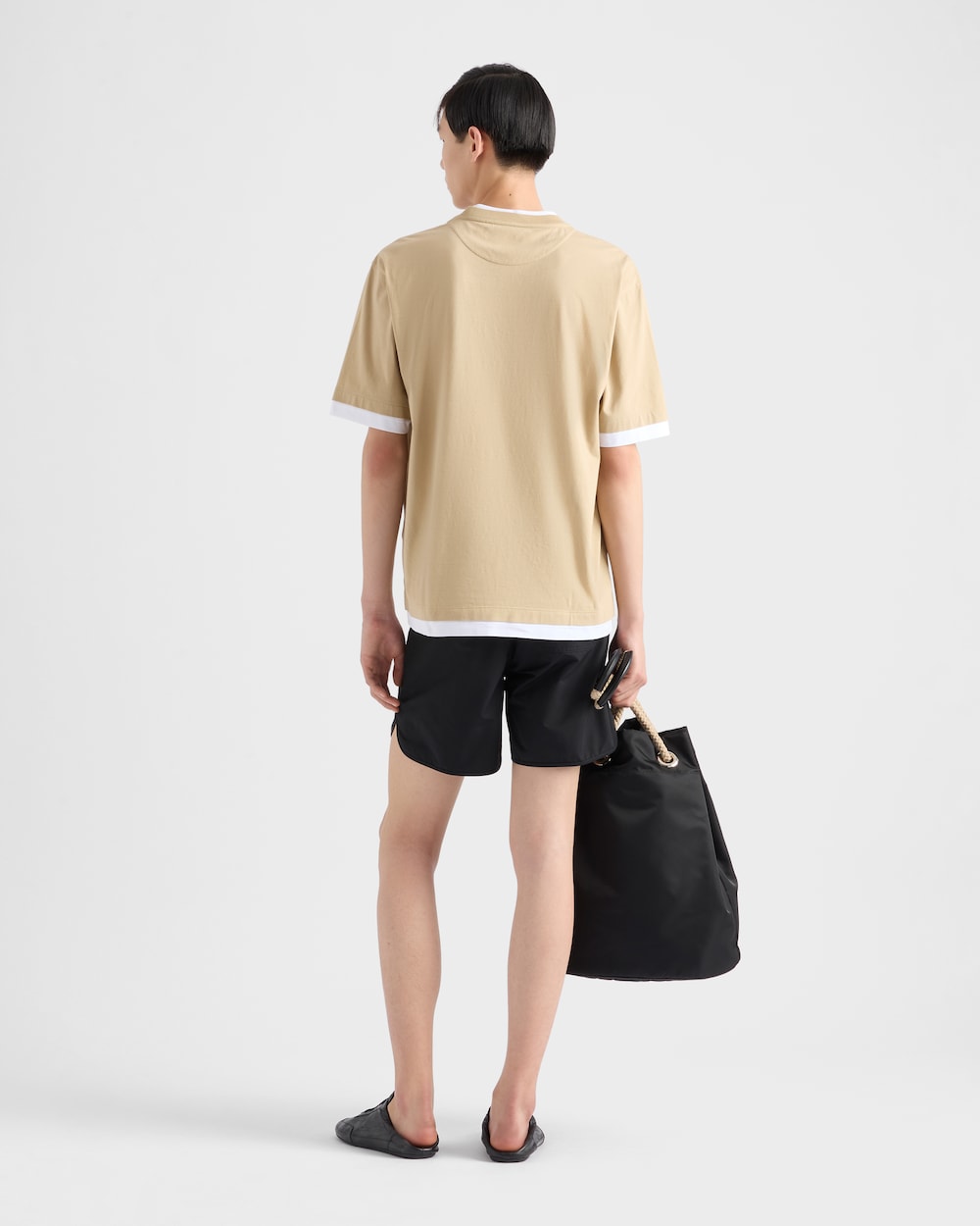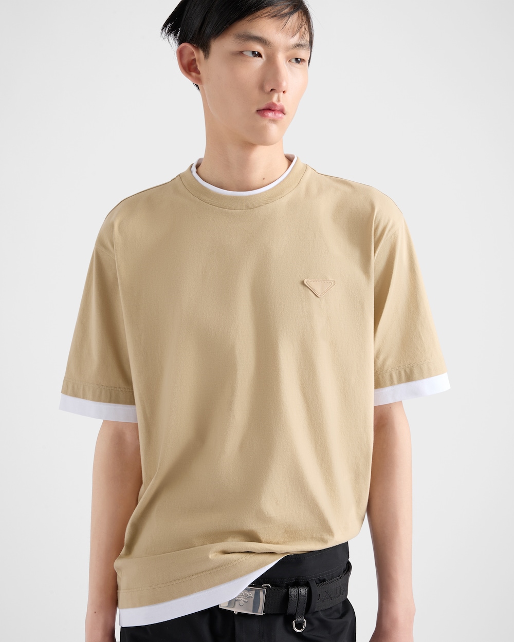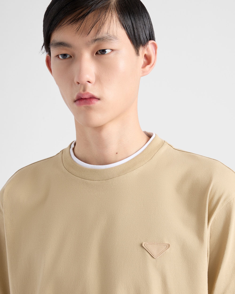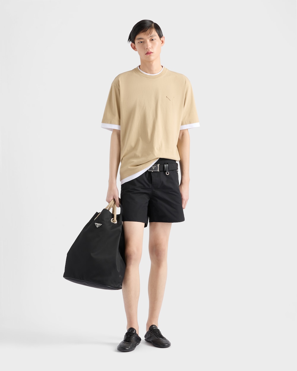 クラシカルなコットンTシャツのスポーティなシルエットを、レイヤーとコントラストで新たに再解釈。象徴的なファブリックトライアングルロゴをあしらったリラックスフィットのスタイル。