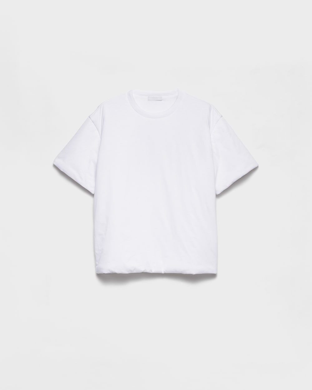 このTシャツは、ワードローブの定番アイテムに多様性と現代的な魅力を加えた、革新的でミニマルなデザインで再解釈されています。パッド入りのコットン素材を使用したウェアは、独自のスタイルによって立体感のあるシルエットを生み出しています。