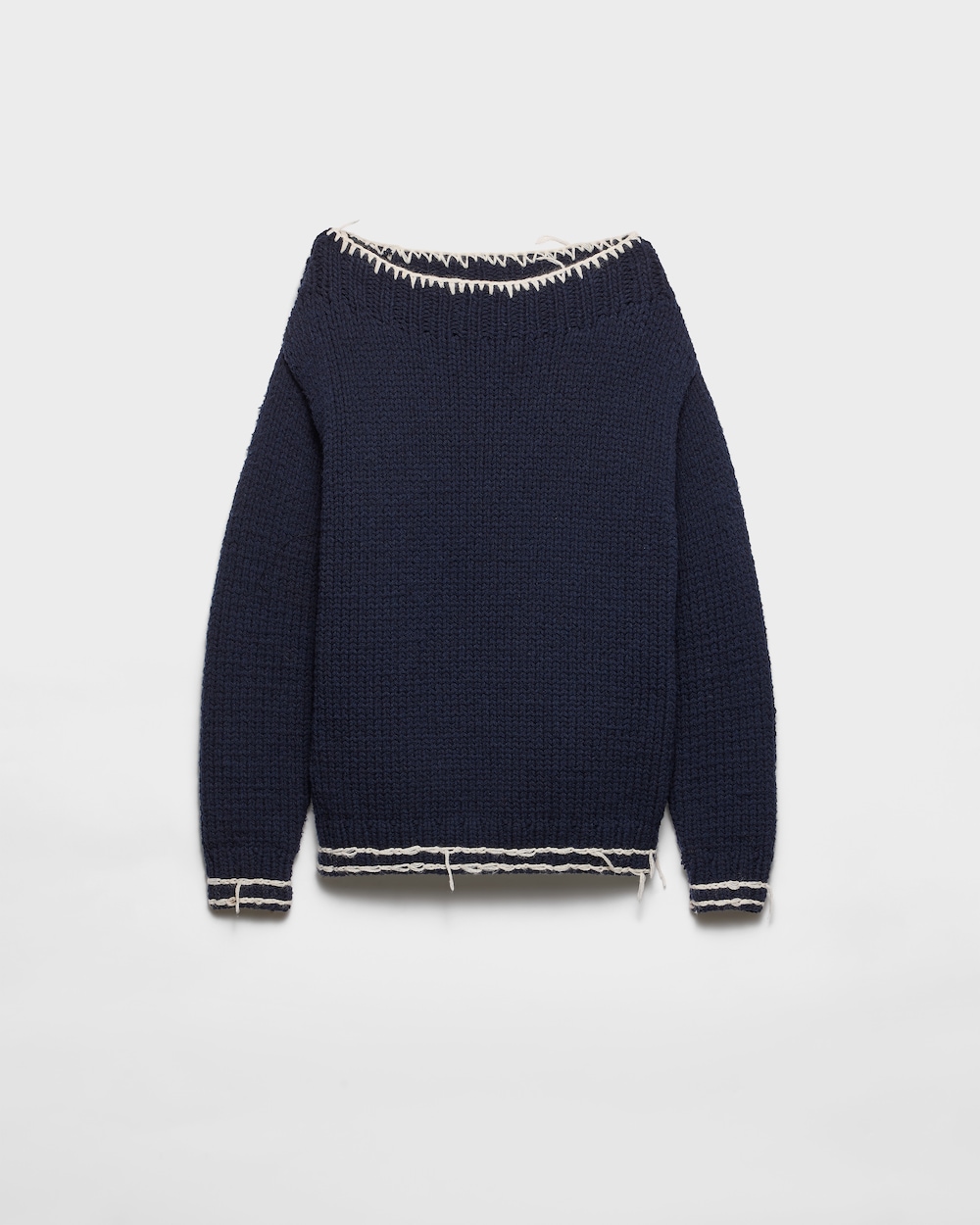 このウールセーターは、ボートネックとボックスシルエットです。このスタイルは、クラシックなノーティカルスタイルを現代的に再解釈し、ボリューム感がありながら柔らかい質感でオーバーサイズのラインを強調しています。衣服はコントラストの効いたステッチで仕上げられ、同色のトライアングルロゴが独特のアクセントを添えています。