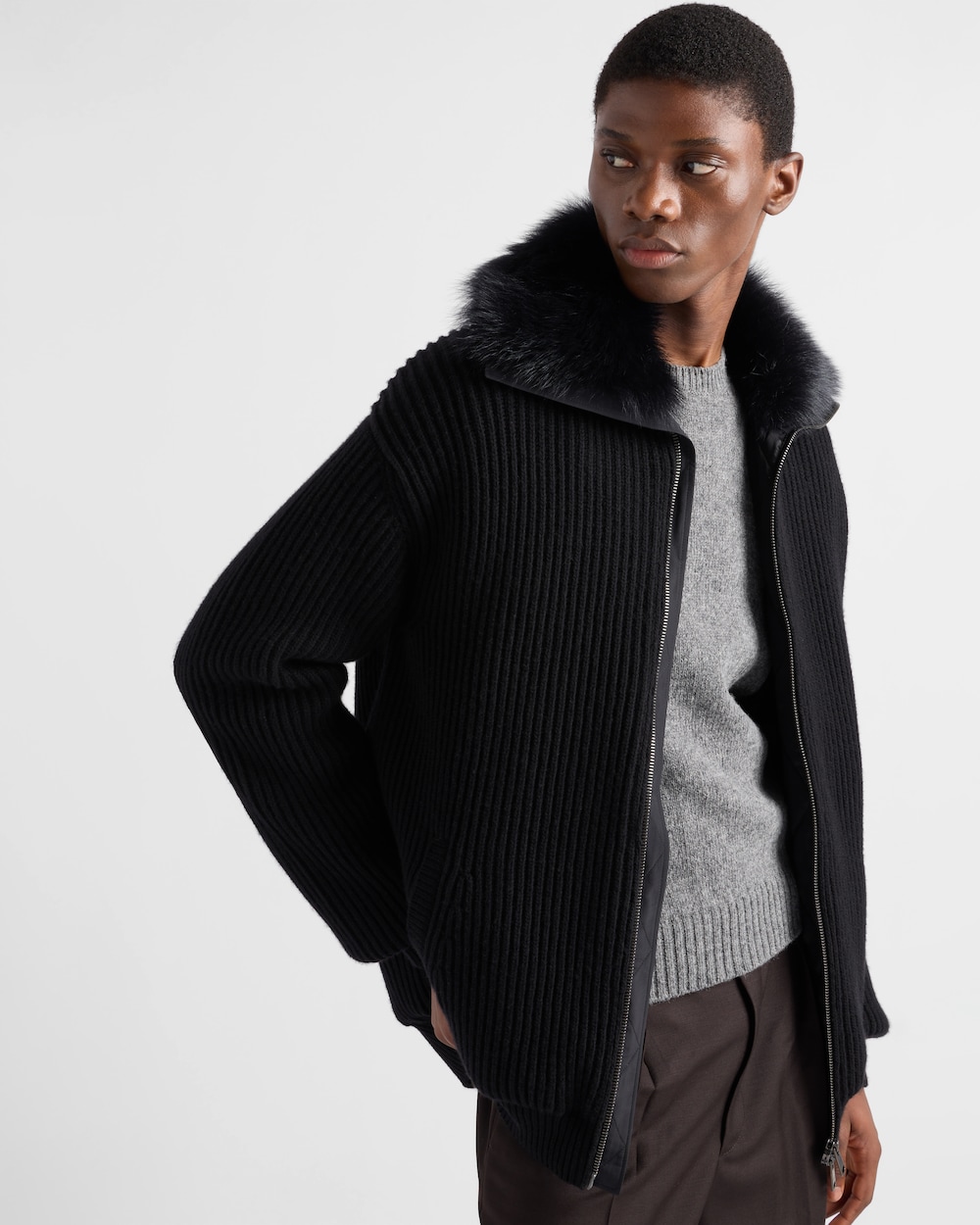 ウールとカシミヤを使用し、スポーティさとエレガントなディテールを組み合わせた上品なカーディガン。洗練されたシルエットにシアリングの襟で柔らかなアクセントをプラスし、ニット素材のトライアングルロゴをあしらいました。